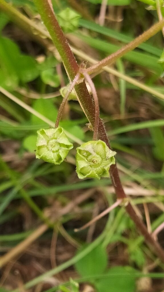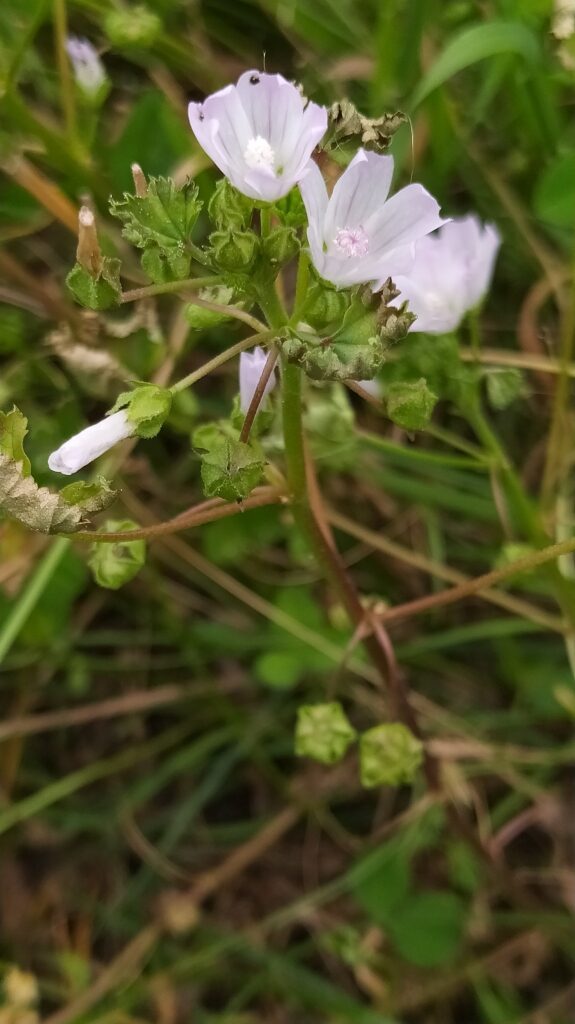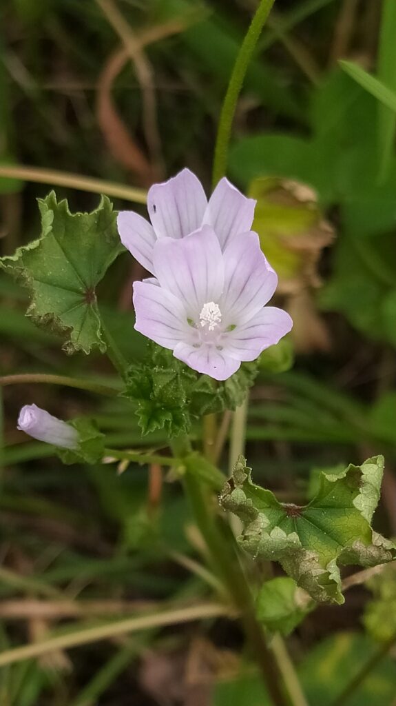 És una herba anual o perenant de 10-50 cm, pilosa, prostrada o ascendent. Les fulles, d’1 a 6 cm, són llargament peciolades amb el limbe suborbicular de base cordiforme i 5-7 lòbuls poc profunds. Les flors, axi·lars solitàries amb els segments del calicle linears o oblongs. Els sèpals són ovats i fan de 6-10 mm concrescents fins a la meitat. Els pètals mesuren de 9-15 mm i són blanquinosos-lilacinis amb l’ungla ciliada; ultrapassen molt netament el calze. Els fruits, de 6-7 mm de diàmetre, tenen els mericarps pubescents, arrodonits al dors i llisos o a penes reticulats.