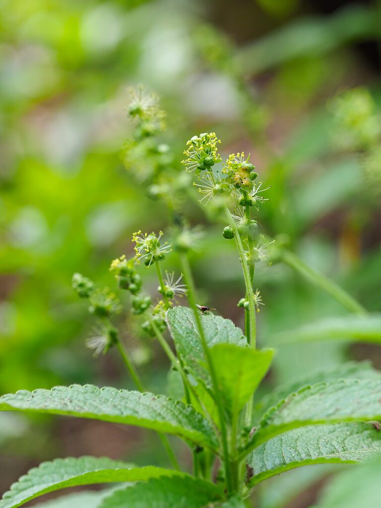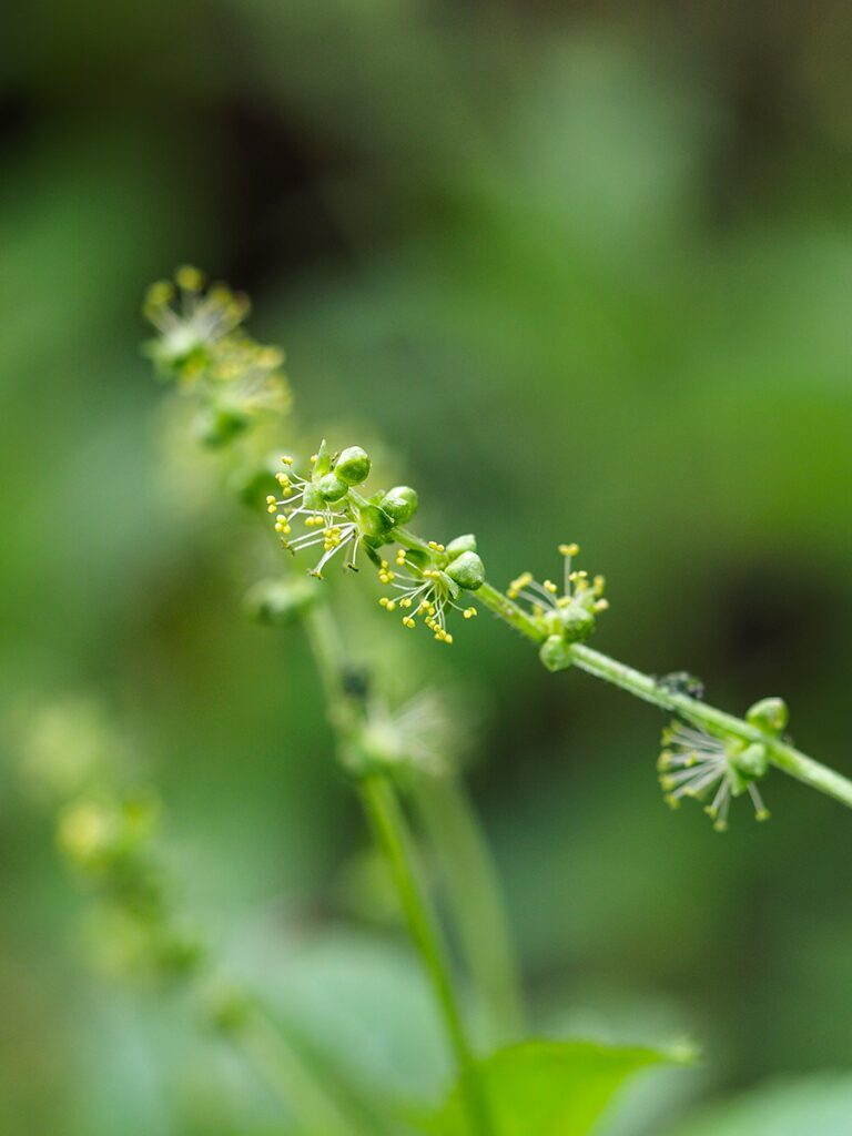 És una herba perenne de 20-40 cm, dioica, rizomatosa, erecta i ± pubescent. La tija no té fulles a la part inferior. Les fulles són oposades, peciolades amb el limbe ovato-lanceolat, d’àpex agut i contorn dentat amb estípules petites i triangulars. La inflorescència de les flors masculines està formada per espigues axil·lars de petits glomèruls distants, damunt d’un peduncle prim i més llarg que les fulles. Les flors femenines són solitàries o en grups laxos de fins a 4 flors amb 3 tèpals d’uns 2 mm, verdosos, glabres i amplament ovats. La càpsula és pedunculada i densament pubescent.