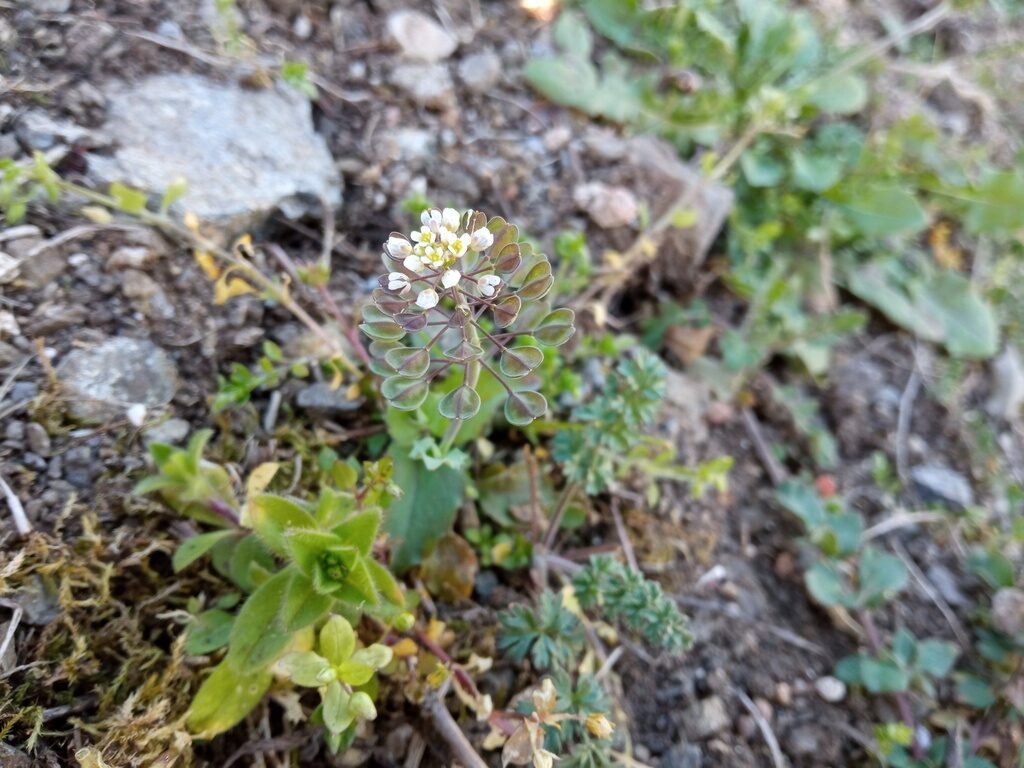 És una herba anual de 5-30 cm, erecta, prima, simple o ramificada, glabra, i glauca. Les fulles són enteres o subenteres, les inferiors en roseta, amb el limbe obovat i llargament peciolat, les superiors són sèssils, ovato-oblongues, auriculades i amplexicaules. La Inflorescència és en raïm, amb pedicels de fins a 3 mm a la floració i laxa a la fructificació. Els sèpals són d’1-1,5 mm, erectes i violàcis, els pètals de d’1,5-2,5 mm blancs i les anteres groguenques. Els fruits en silícules són amplament obcordiformes amb les ales que s’eixamplen progressivament de la base a l’àpex i amb l’estil molt curt.