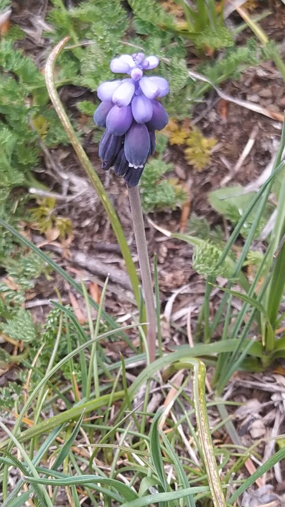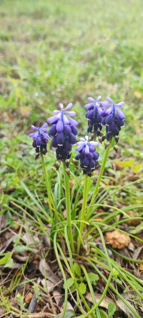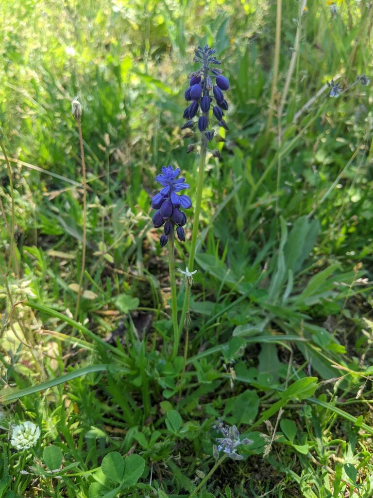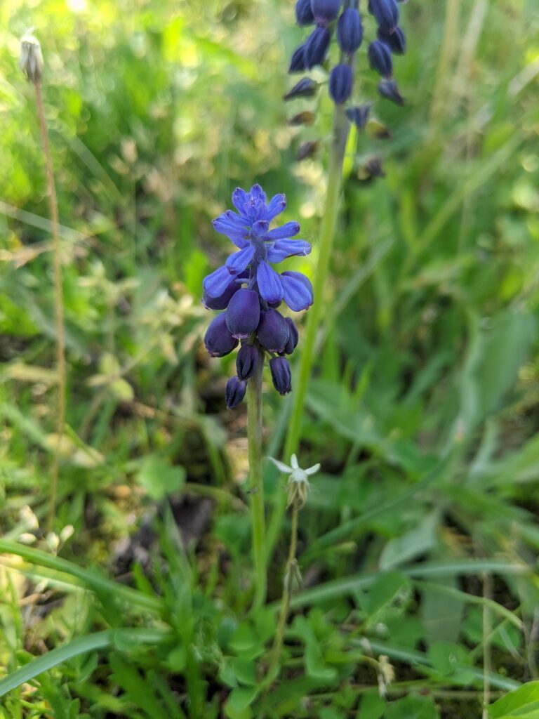 És una herba bulbosa de 10-30 cm. El bulb principal és ovoide; fa de 2-2,5 cm i sol tenir de 10-30 bulbils a la part externa. Cada planta té de 3-9 fulles per bulb, linears caniculades i la tija afil·la. La inflorescència és en raïm dens amb 10-40 flors amb els pedicels patents o pènduls. Les flors fèrtils, d’un blau o violeta molt intens, són normalment flairoses. Tenen el periant urceolat amb lòbuls curts, sovint blanquinosos. Les flors estèrils són més petites i pàl·lides i es troben a l’àpex de la inflorescència. El fruit és en càpsula subglobulosa triquetre, de 5,8 mm.