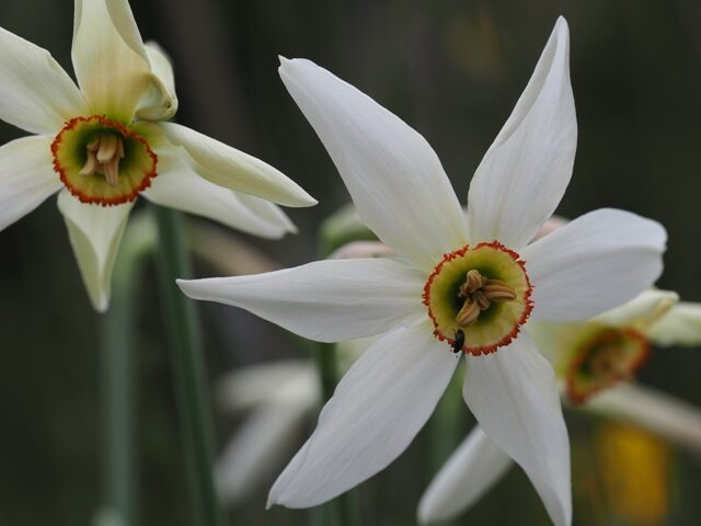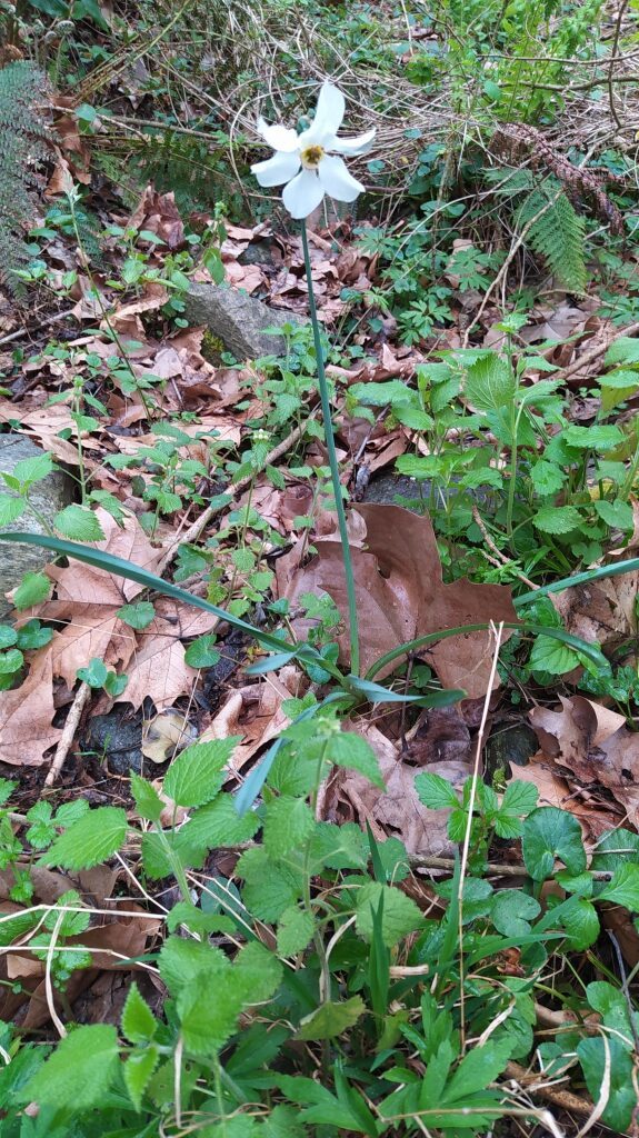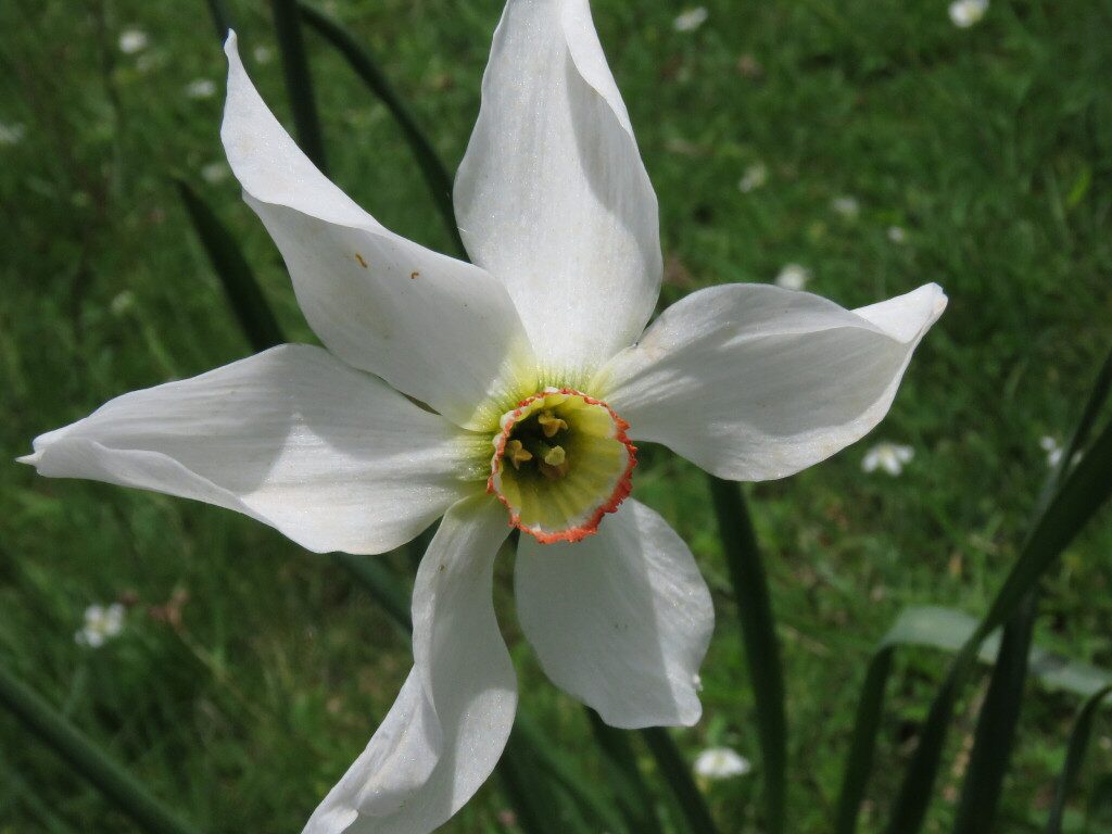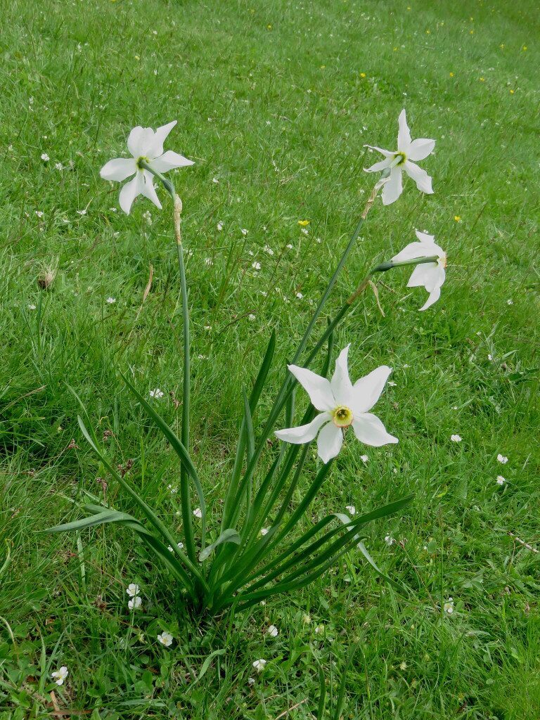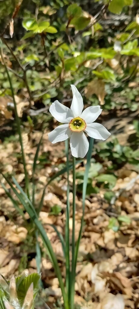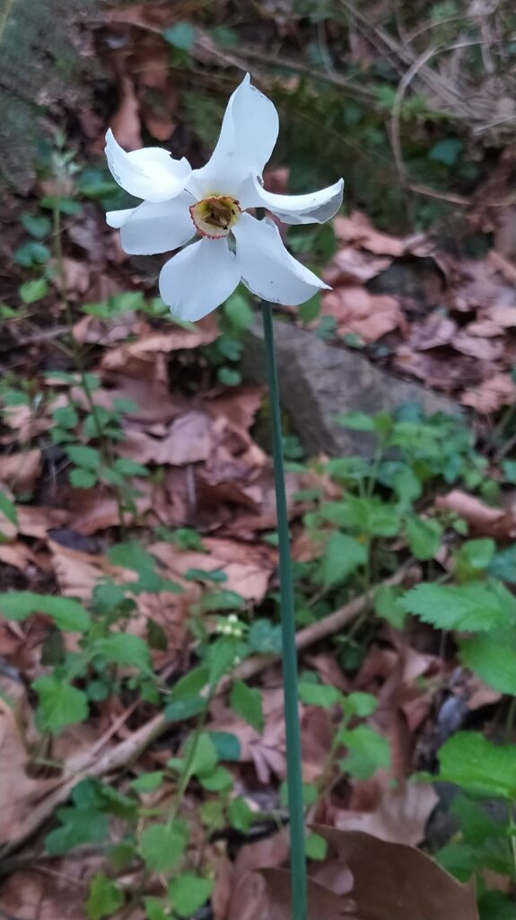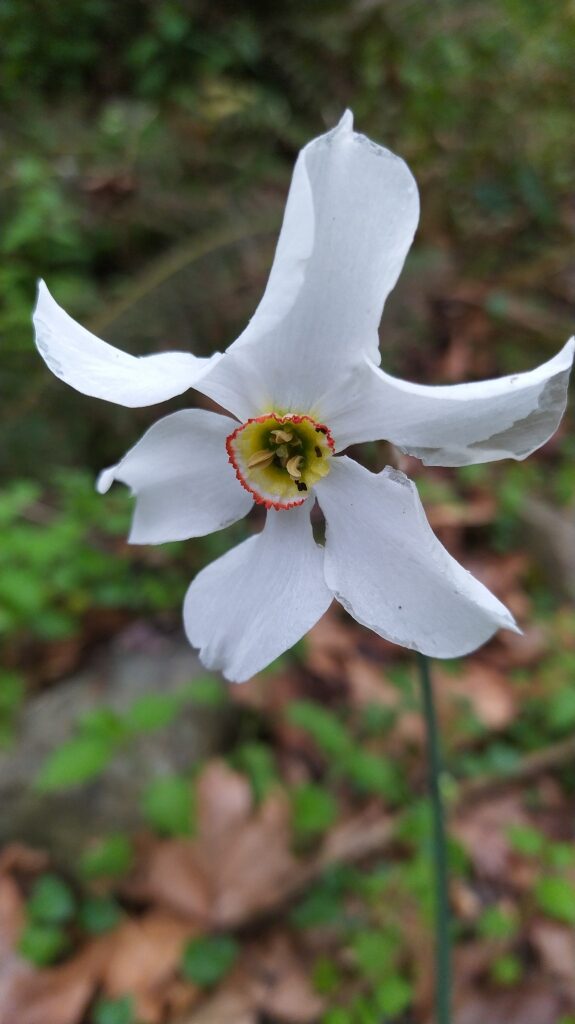 És una planta bulbosa de 30-60 cm, bulb subglobós de 2-4 cm, erecta i glabra. Té 3-5 fulles planes i linears de 20-40 cm de longitud. Les flors són solitàries, pèndules, amb bràctees de 3-5 cm, lanceolades i membranàcies. El tub del periant de 20-30 mm, és verdós i recte. Els segments del periant són blancs de 20-30 mm, ovats i ± patents. La corona és groga d’1-3 mm d’altura amb un voraviu vermell o de color taronja. Els filaments estaminals són grocs. El fruit és una càpsula oblongo-ovoide.