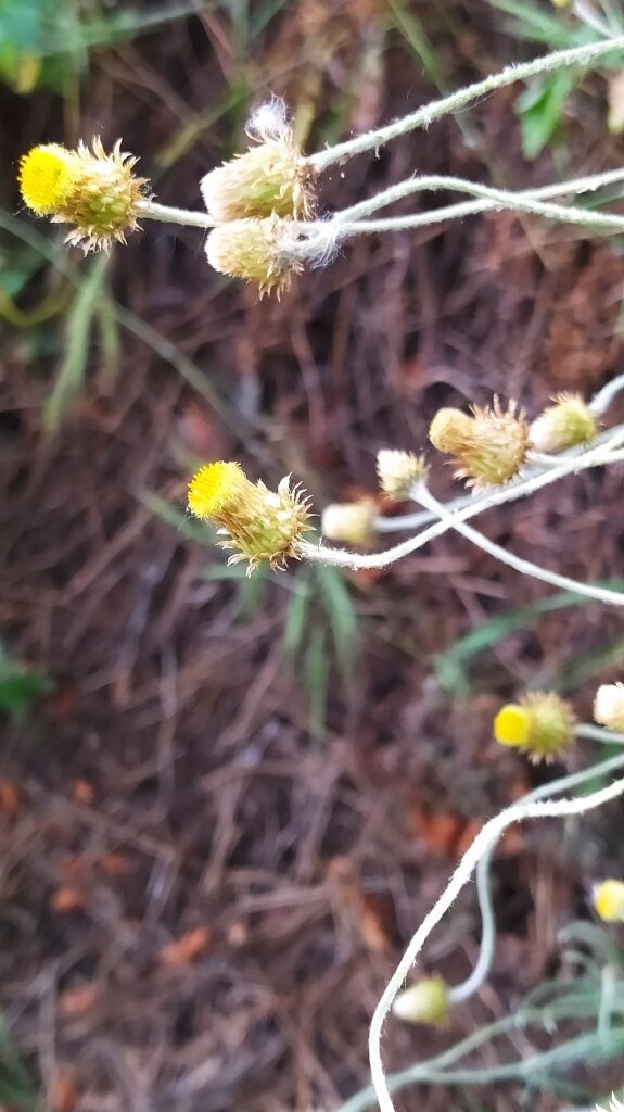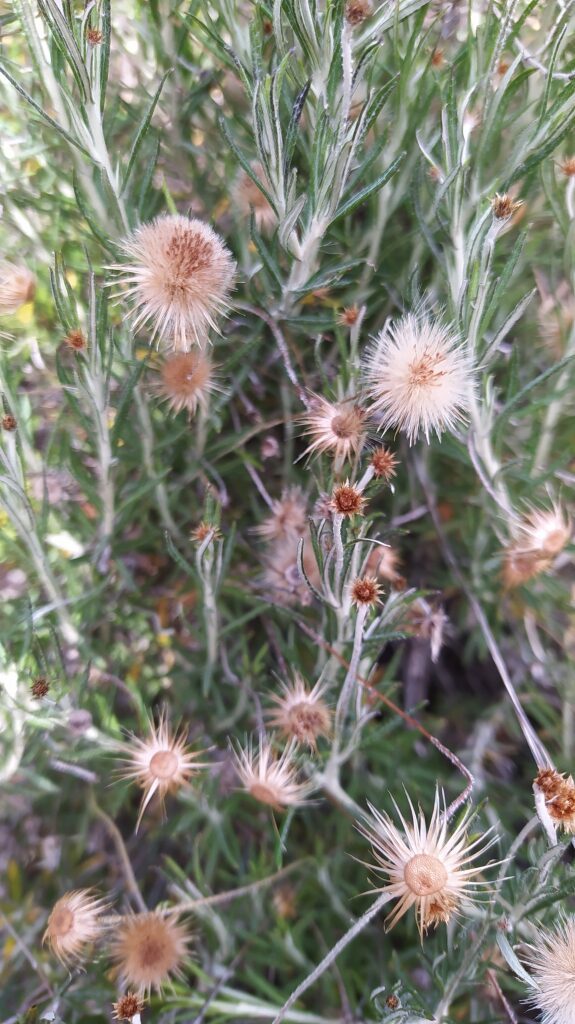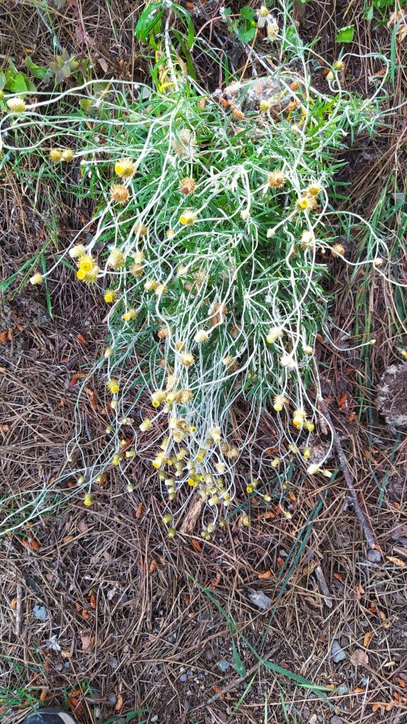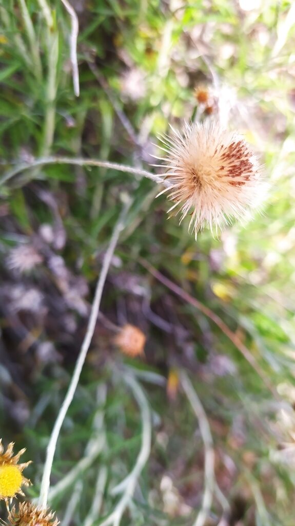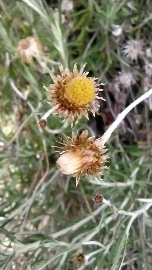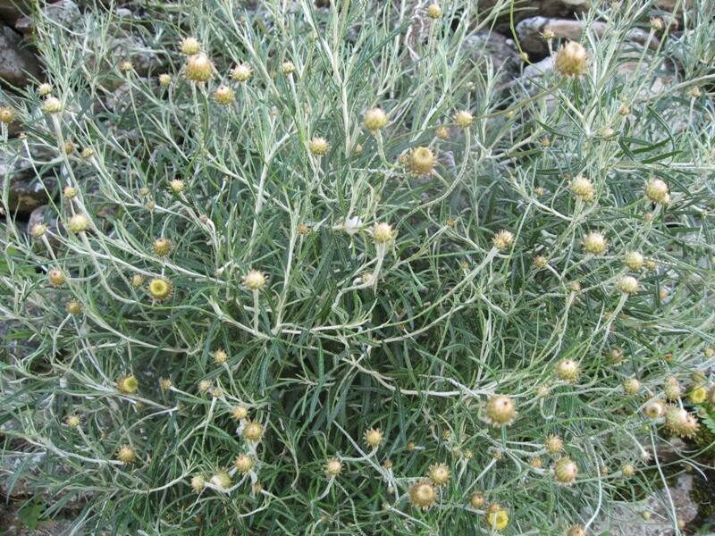 És una mata de 10-40 cm, llenyosa i ramificada amb les tiges ± erectes i finament albo-tomentoses. Les fulles són linears o lanceolato-linears, amb el marge enter o finament denticulat, ± revolutes, verdes a l’anvers, albo-tomentoses al revers. La inflorescència està formada per capítols solitaris de 6-12 mm de longitud, finalment eixamplats. El marge de les bràctees involucrals mitjanes és ondulat, les externes el·líptico-oblongues i finalment patents, les internes linear-lanceolades, ± agudes, totes d’un groc rogenc o brunes. Les flors són totes tubulars. Els fruits són aquenis de 0,9-1 mm amb papus de 6-7 mm.