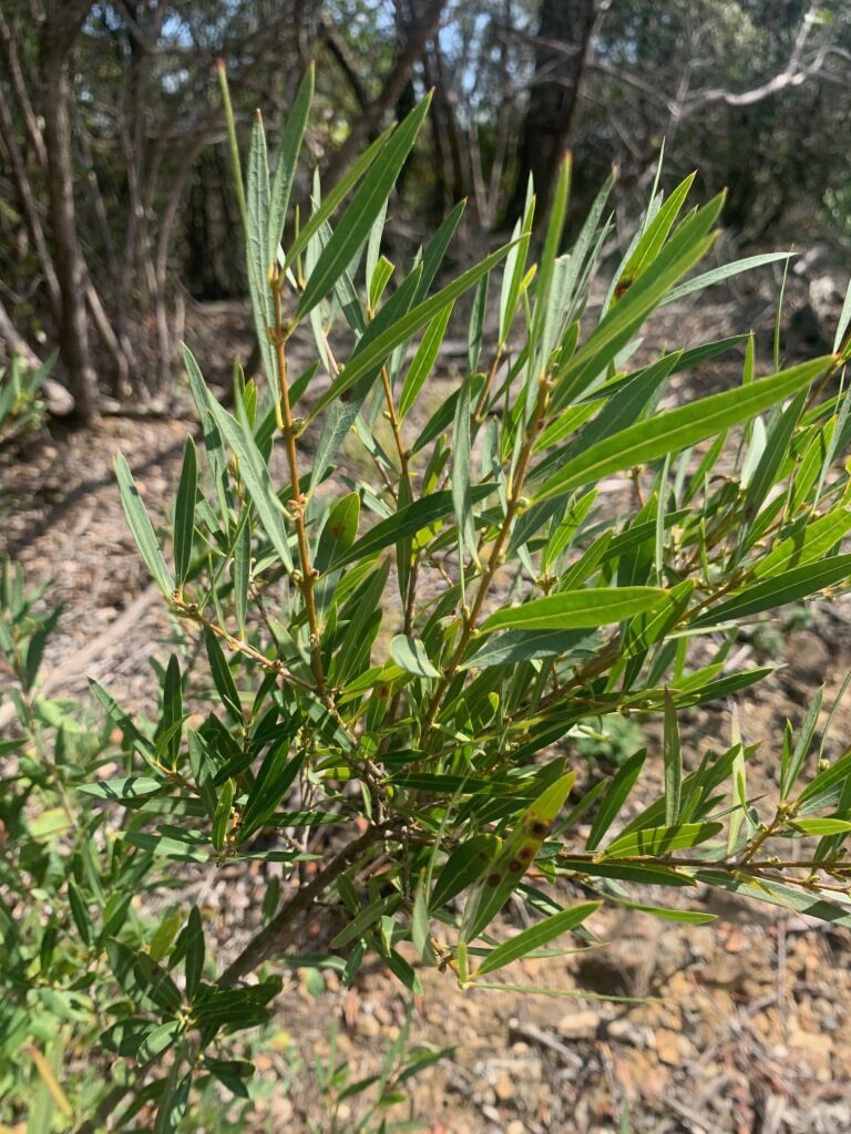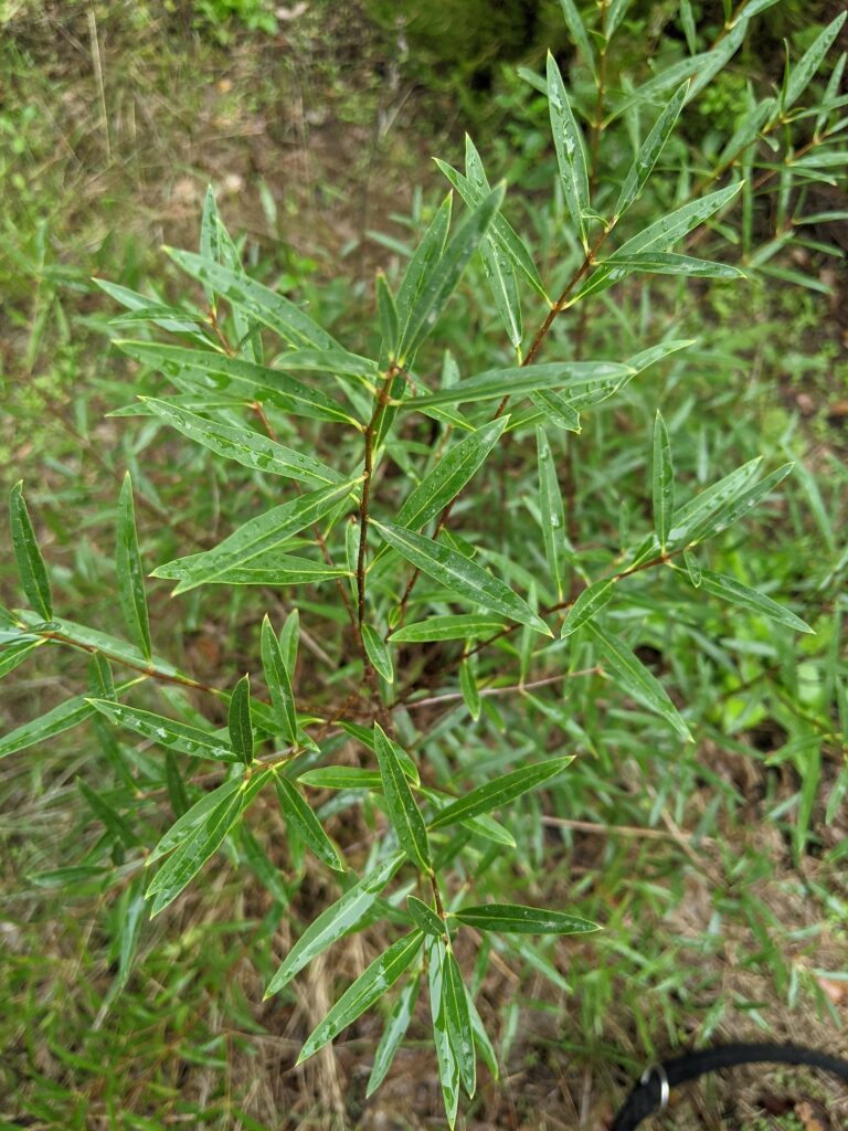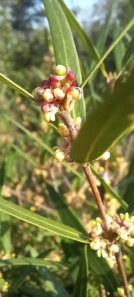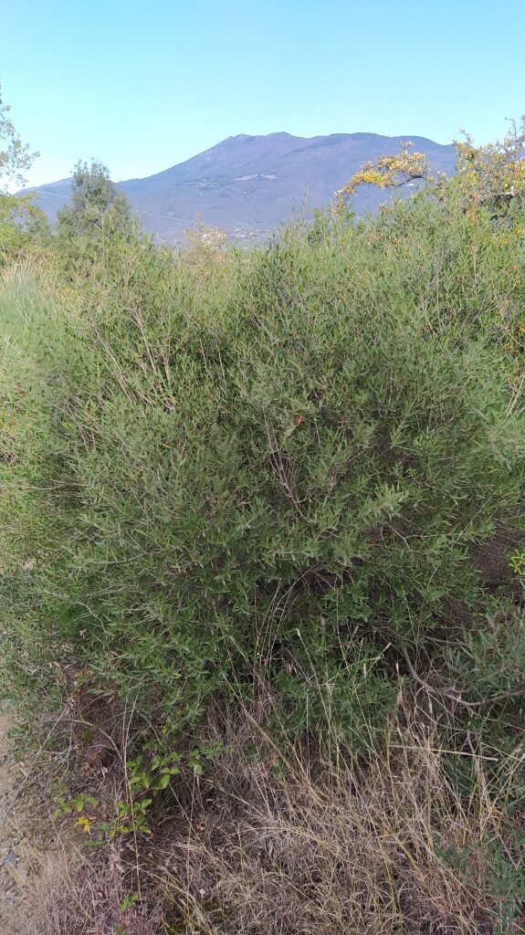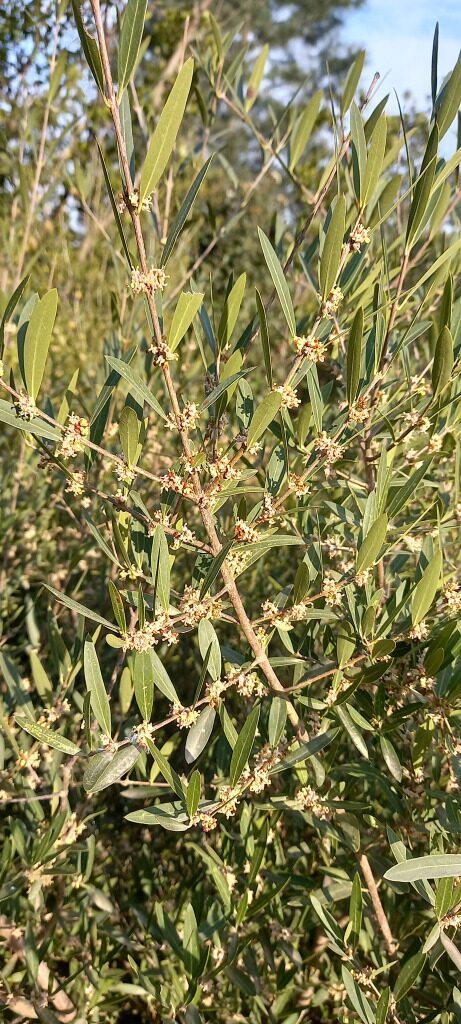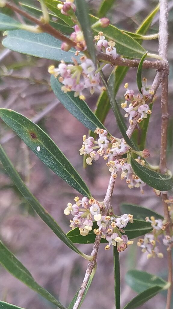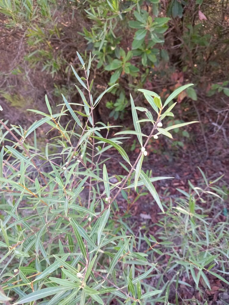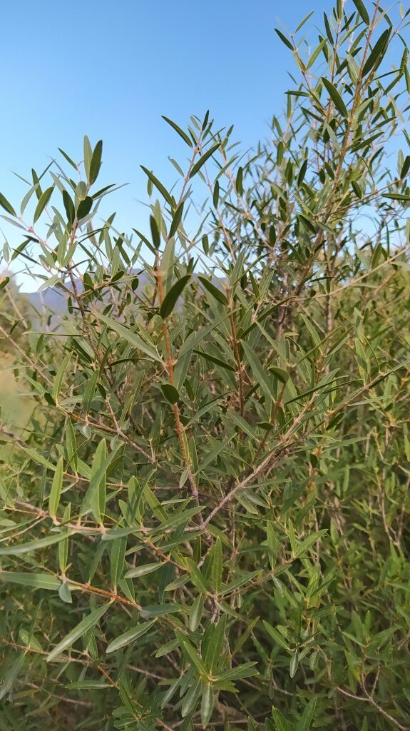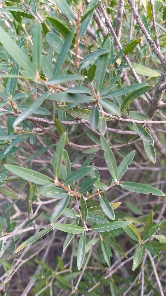 És un arbust d’1-2,5 m, glabrescent, de branques suberectes i escorça grisenca. Les fulles són oposades, coriàcies, curtament peciolades i amb el limbe linear-lanceolat o oblongo-lanceolat i 4-6 nervis secundaris poc visibles. Les flors són petites, verdoses i agrupades en curts raïms axil·lars; el calze és campanulat amb 4 lòbuls, la corol·la rotàcia, blanc-verdosa i amb 4 lòbuls amb el tub molt més curt que els lòbuls, i 2 estams amb els filaments soldats al tub de la corol·la. El fruit és en drupa apiculada, negrosa i de 4-5 mm.