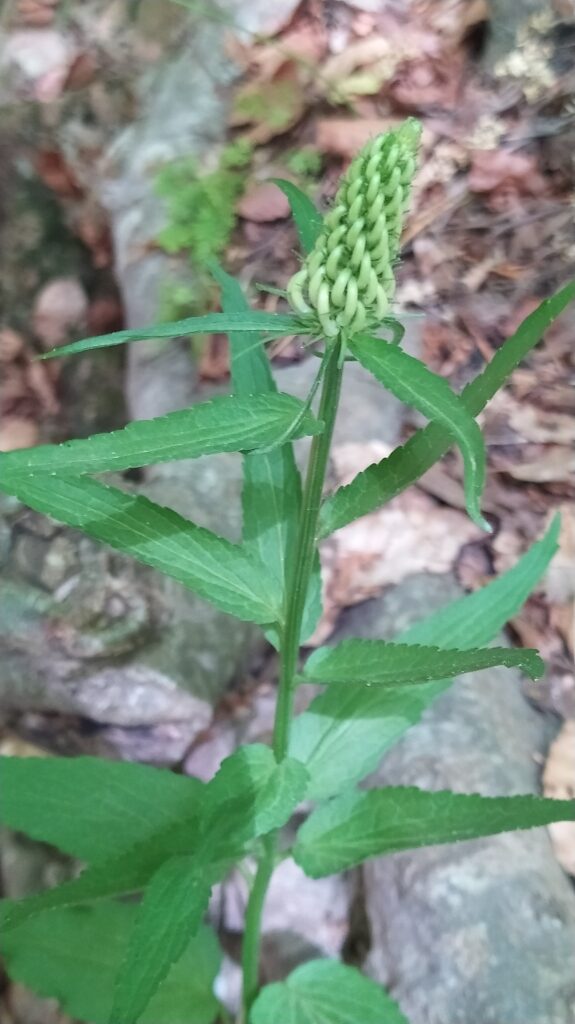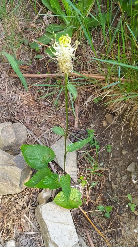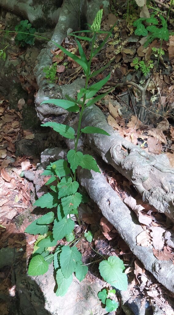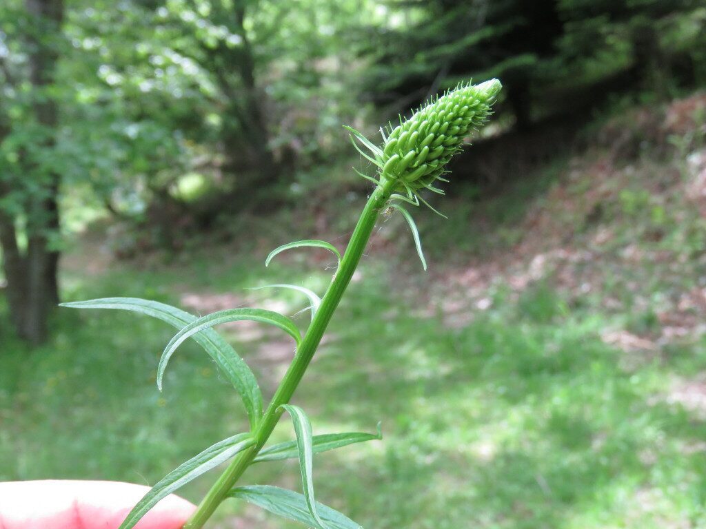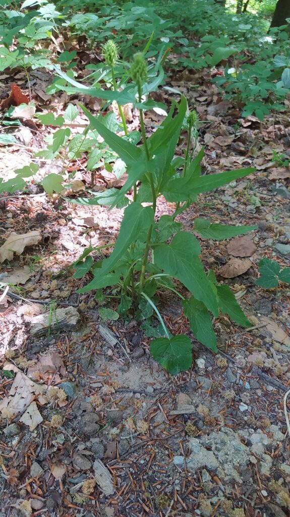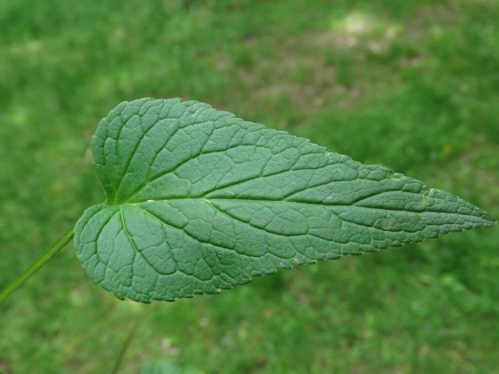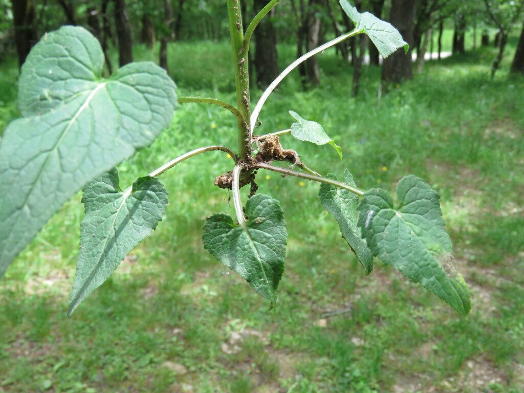 És una herba perenne de 30-70 cm, erecta i glabrescent amb les tiges simples. Les fulles basals tenen un pecíol de 5-20 cm i el limbe és ovato-cordat i amb el contorn dentat; les caulinars inferiors són progressivament més petites i les caulinars superiors sèssils i estretament lanceolades. La inflorescència està formada per espiga cilíndrica o ovoide-oblonga. Les flors són pentàmeres, el calze té les dents de 3-5 mm estretament triangulars, i la corol·la és blanquinosa o blava ± corbada abans de la floració i està formada per un tub soldat fins a prop de l’àpex, a la floració el tub s’obre en 5 lòbuls estretament linears. L’estil és llargament exsert després de la floració amb 2 estigmes. El fruit és una càpsula de 4-6 mm curtament cilíndrica.