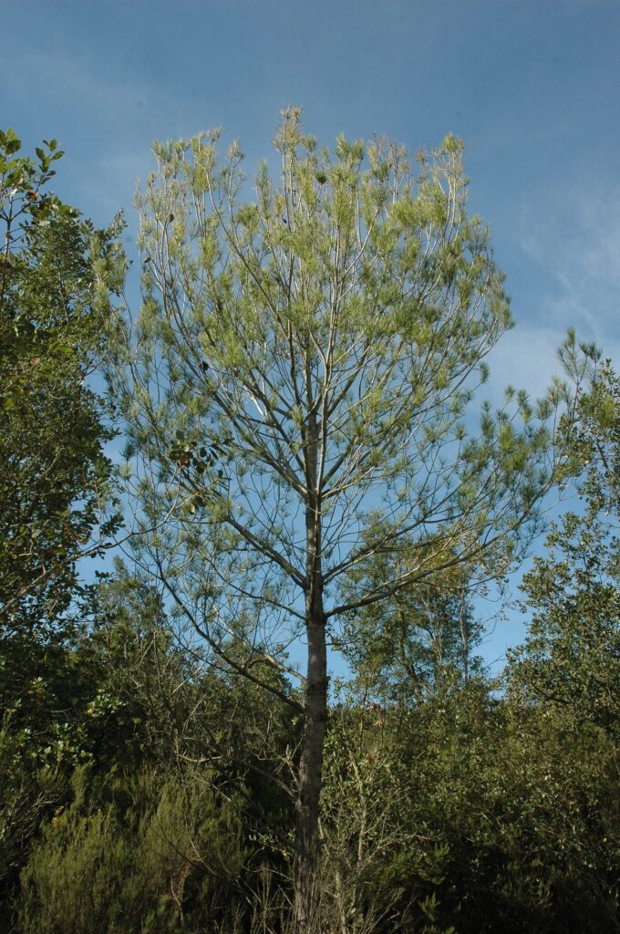 És un arbre perennifoli d’aspecte cònic amb l’escorça llisa i grisenca en individus joves i tortuós i amb la capçada irregular i esclarissada i l’escorça fosca i clivellada en peus madurs. Les fulles són simples, agrupades de dues en dues, molt primes, d’un verd clar i de 4-12 cm de llarg. Les flors són separades, les masculines agrupades en cons de color daurat, nombrosos i situats a l’extrem dels branquillons, i les femenines en cons solitaris o en grups de dos o tres i de color purpuri. Les pinyes maduren a la tardor del segon any i persisteixen a l’arbre molts anys.