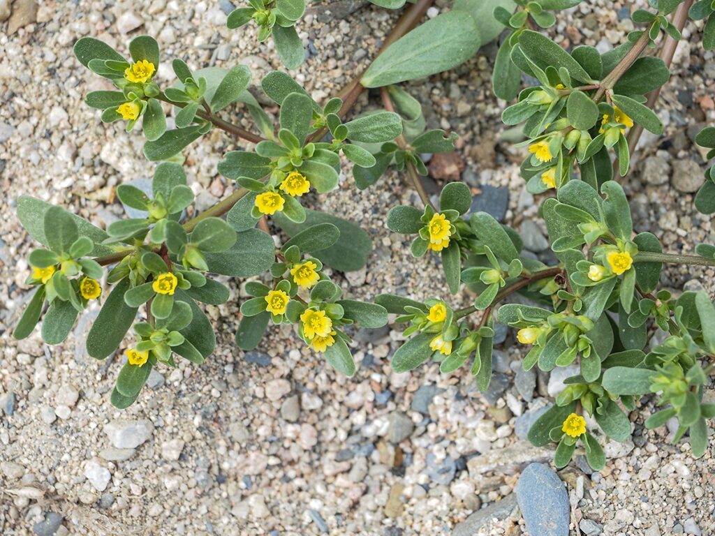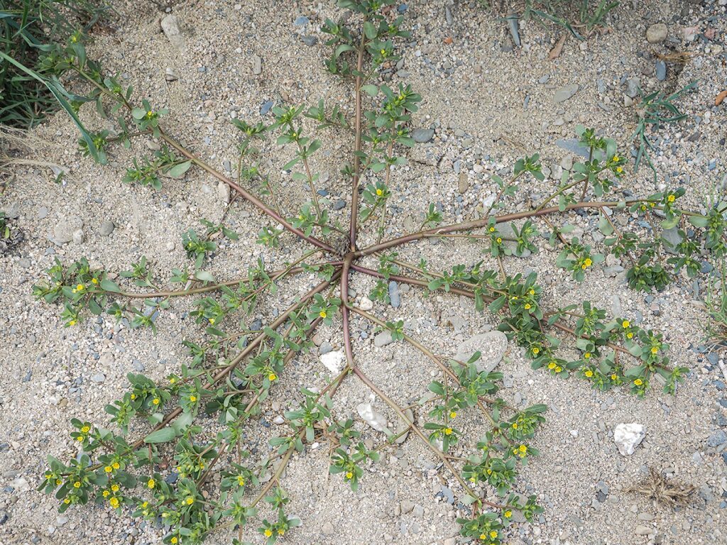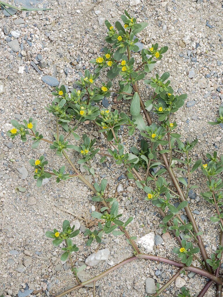 És una herba anual de 10-40 cm, prostrada, ramificada, glabra i suculenta. Les fulles són ± oposades (de vegades les inferiors esparses), sèssils, obovato-oblongues, amb contorn enter i àpex obtús i les estípules membranàcies. Les flors són solitàries o en grups de 2-3, tenen 2 sèpals de 4 mm i 5 pètals grocs caducs (rarament 4 o 6). El fruit és una càpsula membranàcia de 3-8 mm que s’obre per dehiscència transversal i que rep el nom de pixidi; les granes són negres i lluents.