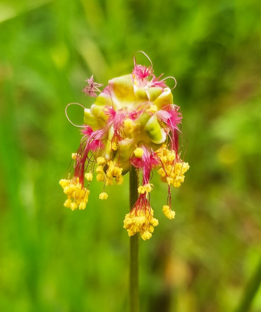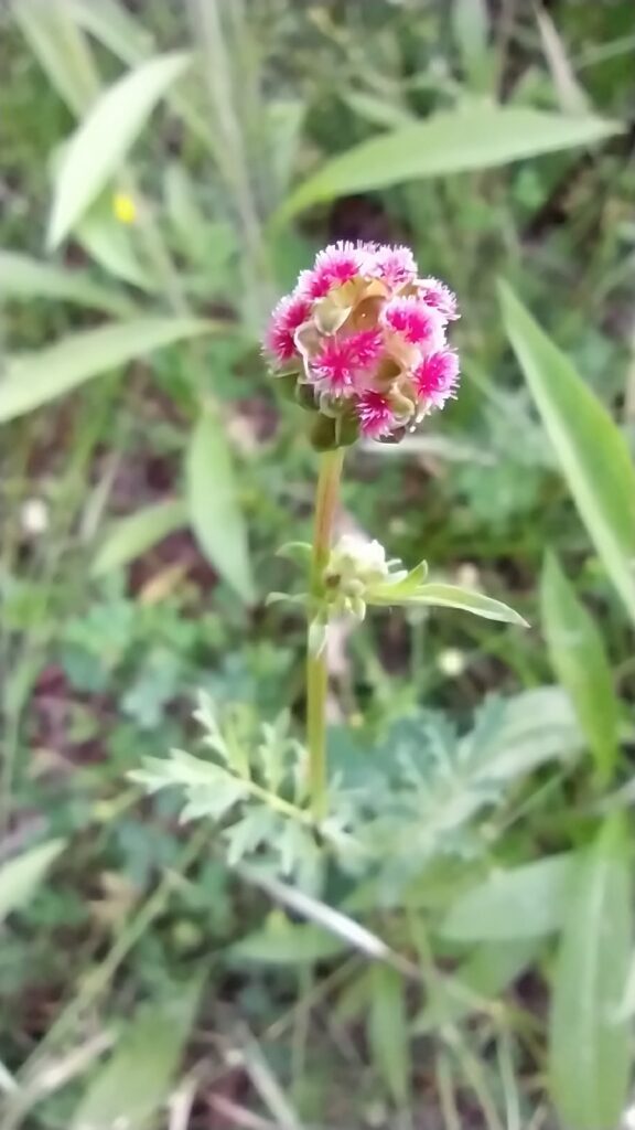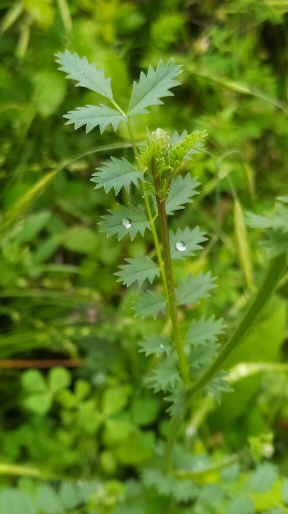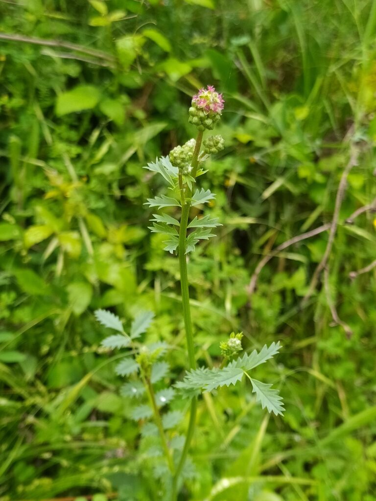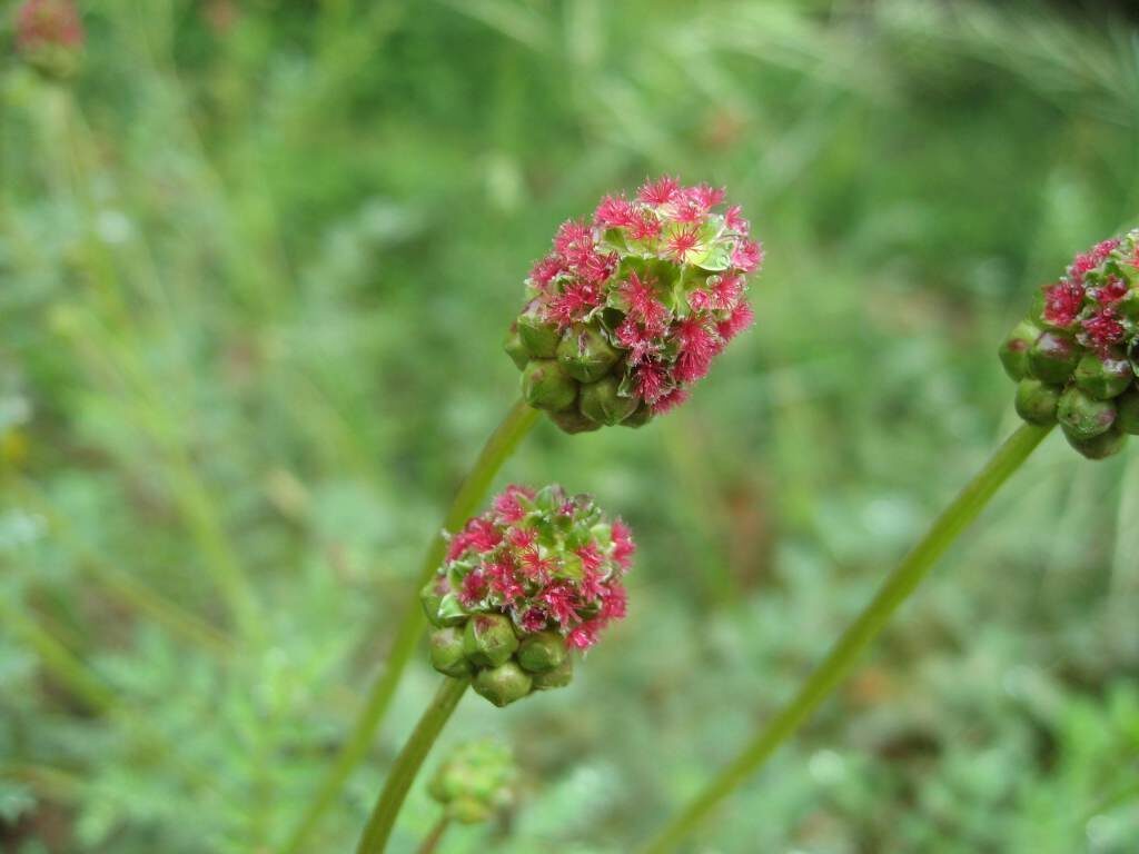 És una herba perenne de 20-60 cm i glabrescent. La tija és simple o ramificada, erecta, ascendent o decumbent i arcuada. Les fulles basals estan disposades en roseta, totes imparipinnades amb 4-12 parells de folíols peciolulats, ovato-el·líptics o oblongs, rarament suborbiculars i amb contorn dentat. La inflorescència és en glomèruls de 7-12 mm amb flors apètales, les superiors femenines, les inferiors masculines i les intermèdies hermafrodites amb sèpals verdosos, estams nombrosos i estigmes plumosos. Els fruits tenen angles alats, ales de marge agut ±sinuós i cares fortament rugoso-verrucoses.