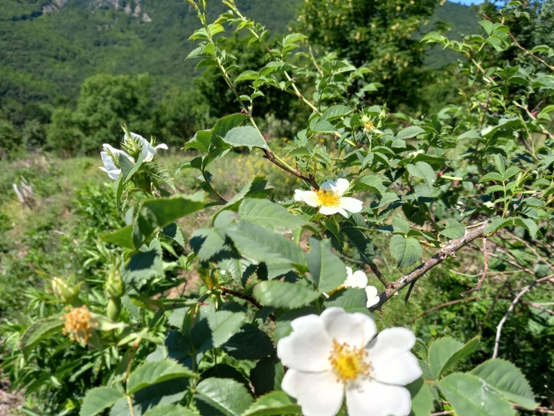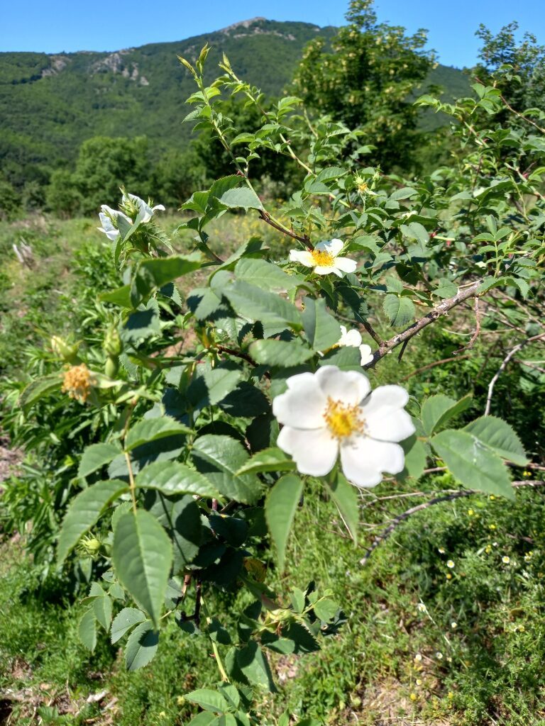 És un arbust caducifoli d’1-3 m amb tiges amb els agullons forts i ± falciformes. Les fulles són pinnaticompostes amb el folíols glabres o glabrescents, ovats, generalment d’àpex agut i contorn dentat normalment simple. Les estípules superiors són ± dilatades. Les flors, de 3-5 cm de diàmetre, són solitàries o en grups amb pedicels glabres. La corol·la té els sèpals reflexos després de la floració, caducs i generalment més curts que la corol·la, els pètals són de color de rosa o blancs i els estils lliures. El receptacle fructífer és generalment ovoide i glabre.