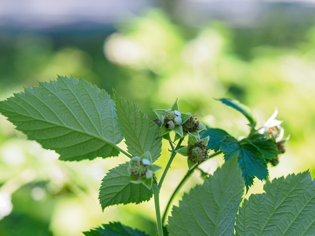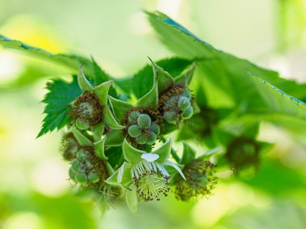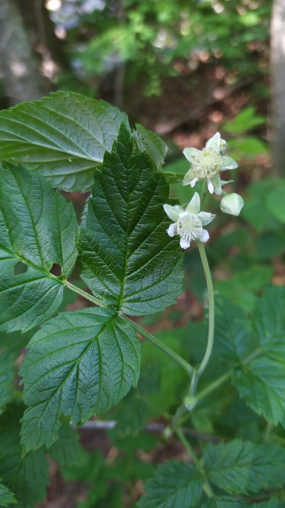 És un arbust caducifoli de 60-120 cm, de turions drets i pruïnosos amb agullons rectes, febles i nombrosos. Les fulles són pinnaticompostes amb el pecíol canaliculat i 3-7 folíols verds i glabrescents a l’anvers i blancs i tomentosos al revers, el contorn és irregularment serrat i el folíol terminal peciolulat, (els altres subsèssils); les estípules són filiformes i ciliades. Les flors són ± pèndules, els sèpals lanceolats i tomentosos, els pètals blancs, petits i erectes, els estams blancs i el receptacle cònic. El fruit madur (el gerd) comestible molt apreciat, és vermell i pilós.