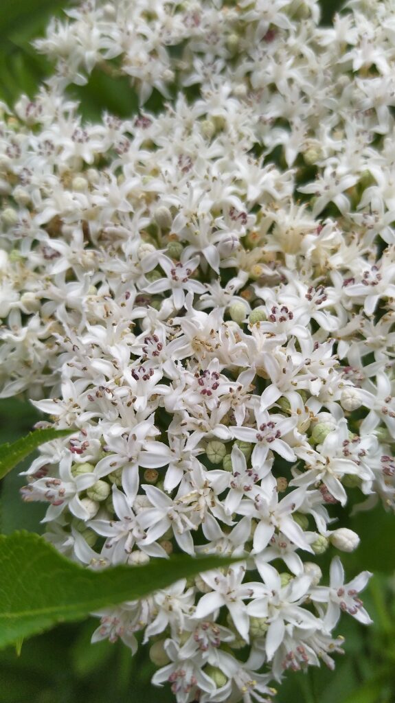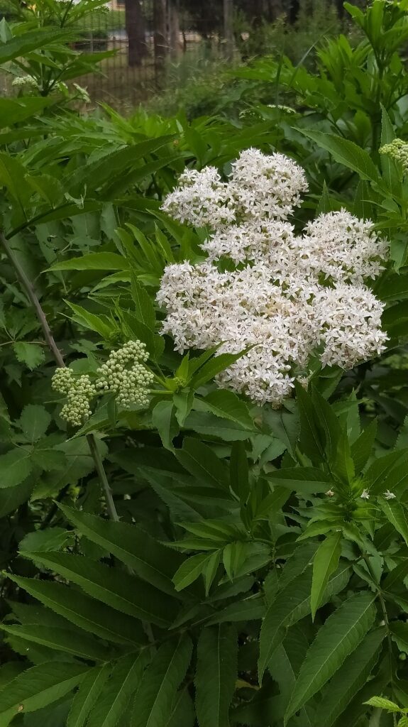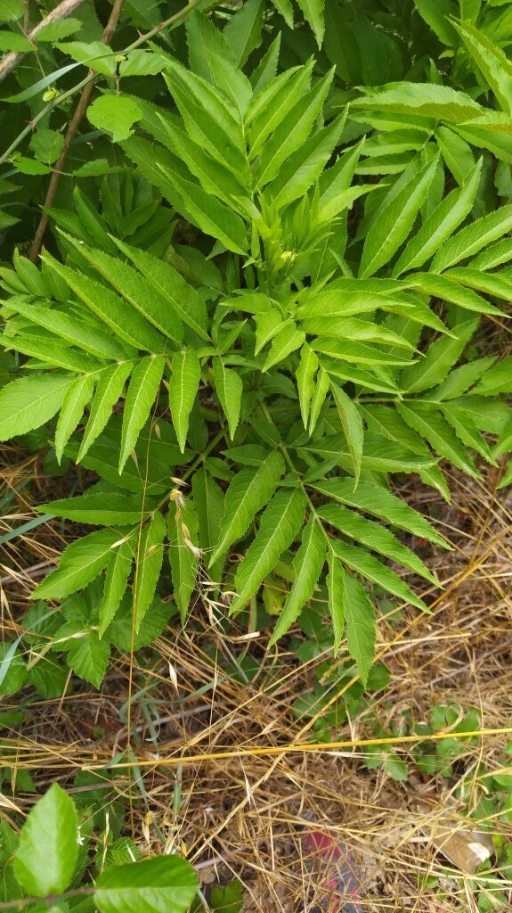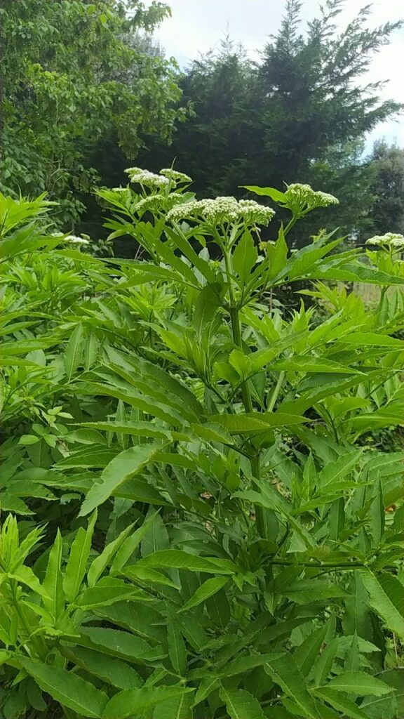 És una herba perenne, de 50-150 cm, fètida, glabrescent, amb tiges verdes, erectes, simples o poc ramificades, amb costes prominents i medul·la blanca i amb rizoma reptant. Les fulles són estipulades, oposades amb 5-9 a vegades i compostes de fins a 13 folíols subsèssils, lanceolats, irregularment serrats, d’àpex agut o acuminat i amb la base atenuada. La inflorescència, de 5-16 cm de diàmetre, és corimbiforme amb 3 radis primaris, a vegades més, el calze glabre amb un tub de 1,3-1,6 mm i lòbuls amplament triangulars, la corol·la rotàcia, blanca, glabra i amb un tub curt i lòbuls ovats, incurvats, apiculats i reflexos a la maturitat. Els fruits són en drupa, glabres, globosos i d’un violeta fosc.