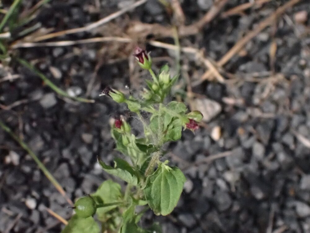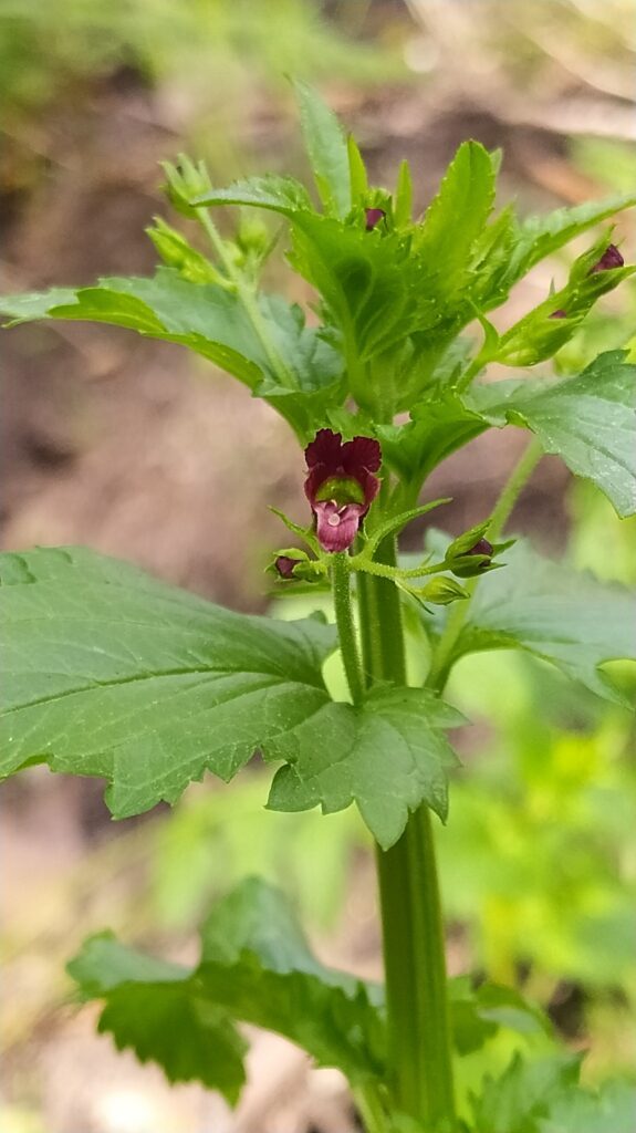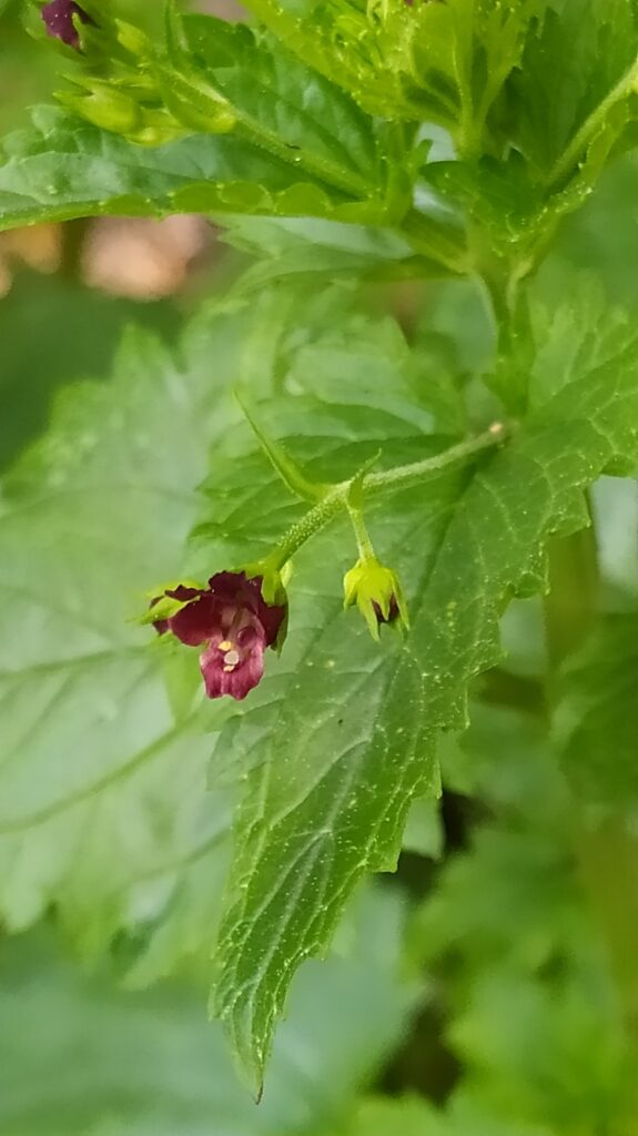 És una herba anual de 10-60 cm, erecta, glabrescent i poc ramificada. La tija es quadrangular, fistulosa i sovint vermellosa. Les fulles són peciolades amb el limbe ovat, àpex agut, base truncada o cordada i contorn fortament irregularment dentat. Inflorescència en panícula foliosa formada per cimes de 2-5 flors. Els pedicels són glandulosos i de longitud de 2-3 vegades la del calze. El calze té els sèpals estretament triangulars, aguts i sense marge escariós. La corol·la és de 5-9 mm i bruna purpurescent. Els estams són inclusos i l’estaminodi suborbicular. El fruit és una càpsula de 4-6 mm subglobosa.