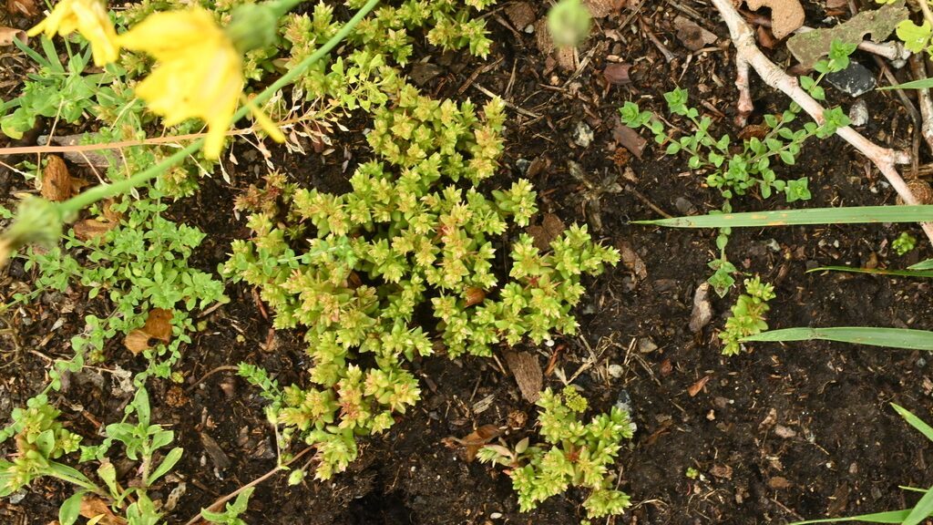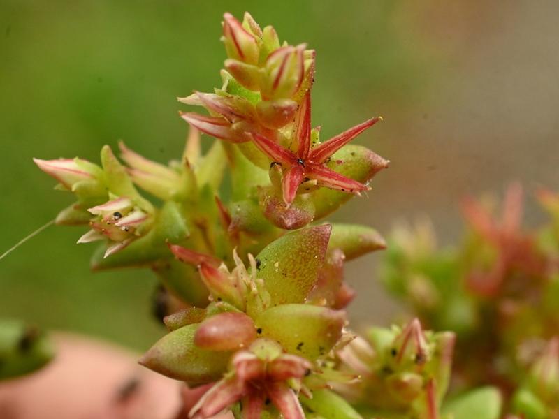 És una herba anual de 2-5 cm, glabra, ordinàriament rogenca, amb tiges erectes sovint ramificades des de la base. Les fulles de 3-6 mm, són imbricades, esparses i ovoides. La inflorescència és cimosa i pauciflora. Les flors són subsèssils i tetràmeres o pentàmeres. Els sèpals estan soldats a la base i els pètals són lliures, estretament ovats i acuminats i d’un blanc-rosaci amb el nervi mitjà vermellós. El fruit és curtament pedunculat i amb els fol·licles estel·lato-patents, llisos i vermellosos.
