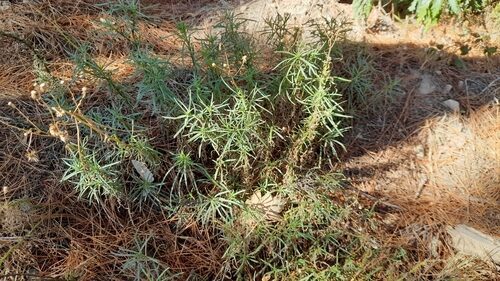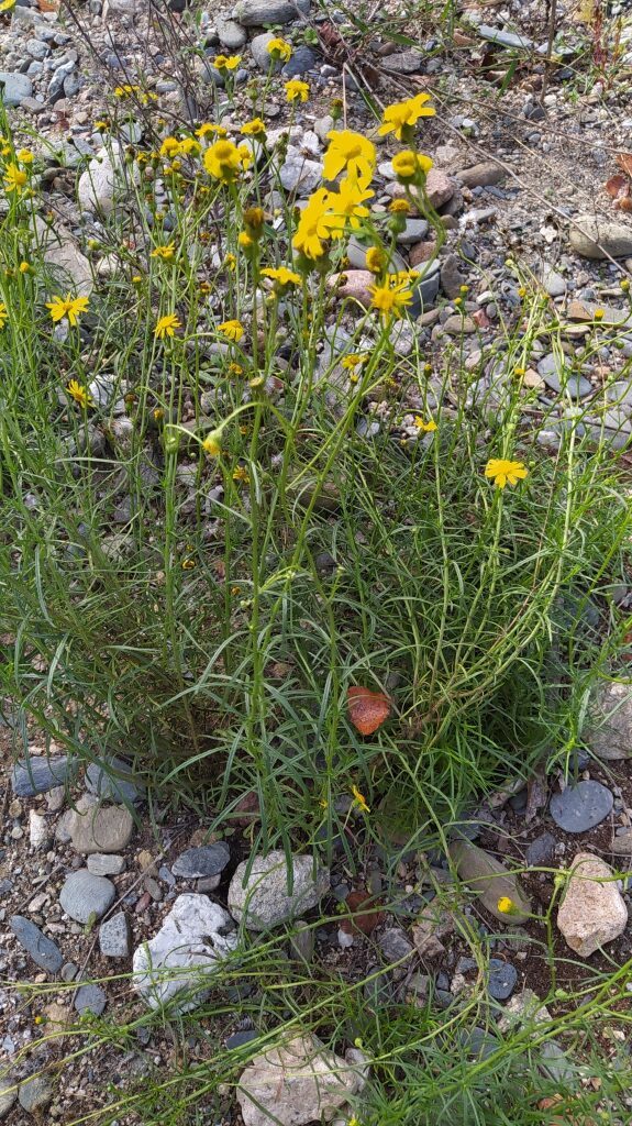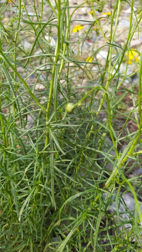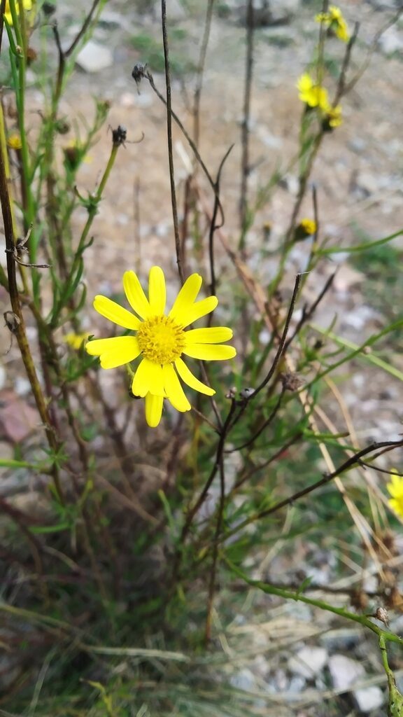 És una planta perenne que mesura de 20-60 cm. Llenyosa a la base, amb les tiges laxament folioses, les fulles linears de 3-8 cm de longitud, el contorn revolut i l’àpex agut. La inflorescència és ± corimbiforme i ampla; els capitols fan de 10-15 mm de diàmetre. Té de 10-15 flors externes ligulades i grogues; les internes, tubulars, són més nombroses. L’involucre és campanulat, amb les bràctees linears, agudes i verdes; normalment amb l’àpex fosc. Aquenis de 2,5-3 mm, subcilíndrics, estriats i coberts de petits pèls aplicats. El papus fa de 4,5-7 mm.