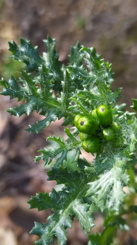 És una herba anual de 5-30 cm, erecta, poc ramificada, ± suculenta i glabrescent o ± arenosa. Les fulles són pinnatipartides o pinnatífides amb els segments irregularment dentats o angulosos. Les fulles inferiors són peciolades, les superiors sèssils i amplexicaules. La inflorescència és subcorimbiforme i amb els capítols grocs; l’involucre és cilíndric i glabre amb les bràctees linears agudes, verdes i amb l’àpex normalment negrós i finalment reflexes. Normalment cap de les flors té lígula. Els aquenis mesuren d’1,5-2,5 mm i són fusiformes i amb pilositat aplicada; el papus fa uns 4,5-7 mm.