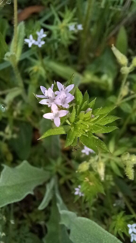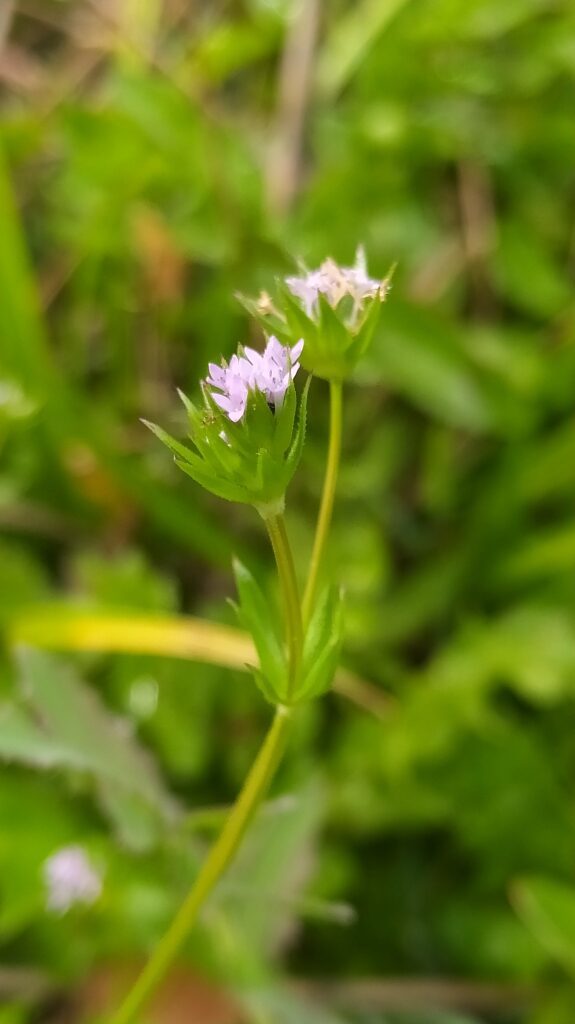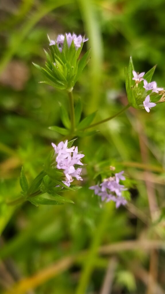 És una herba anual de 10-40 cm, decumbent o ascendent, ramificada i ± escabra. La tija es quadrangular. Totes les fulles són verticil·lades; les inferiors, en verticils de 4, ovades, mucronades i caduques; les mitjanes i superiors, en verticils de 5-6, lanceolades i mucronades. Inflorescència en glomèruls de 4-10 flors, envoltats per un involucre de 10 fulles soldades a la base. El calze és reduït, acrescent a la fructificació. La corol·la, d’un lila blavenc clar, fa de 4-5 mm de longitud, amb 4 lòbuls oblongs, obtusos i un tub de 2,5-3,5 mm. El fruit, de 2-7 mm, està format per 2 mericarps tridentats.