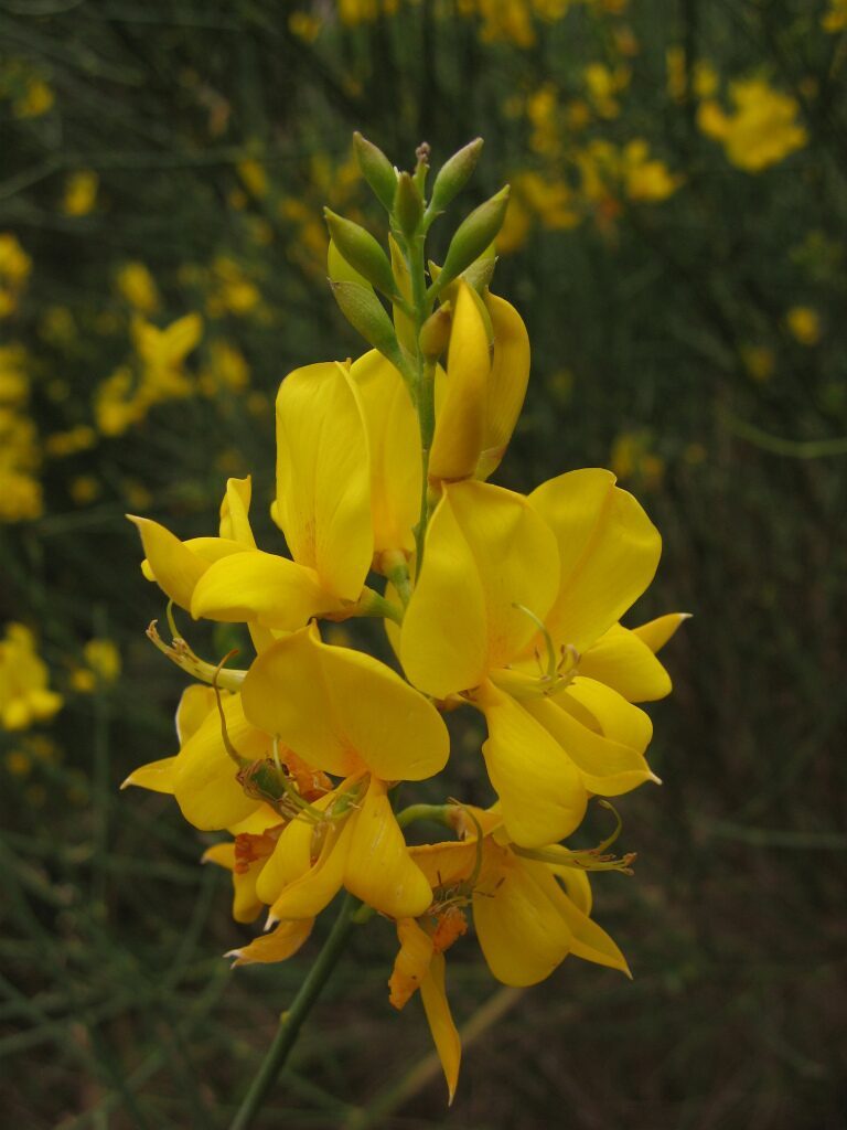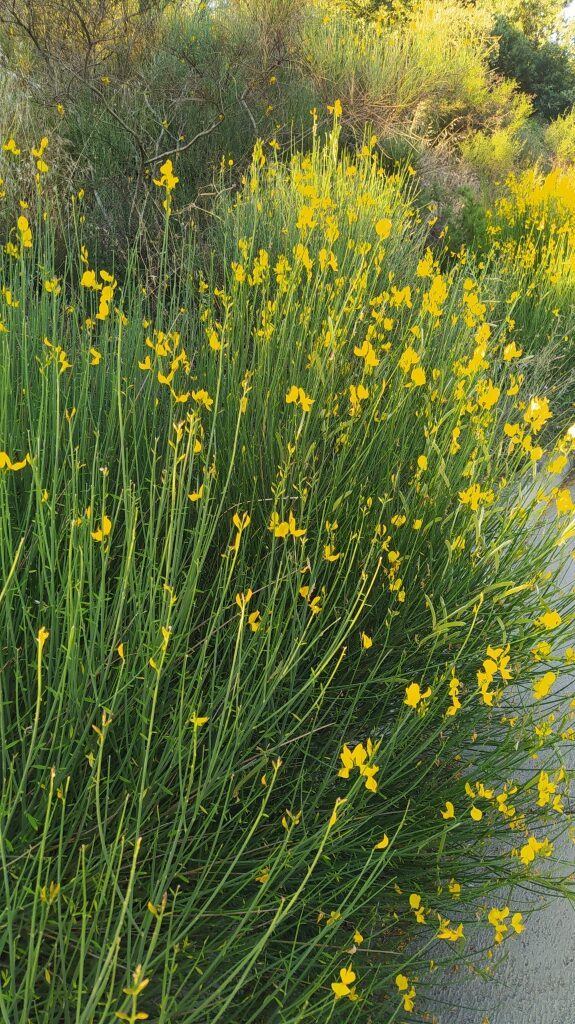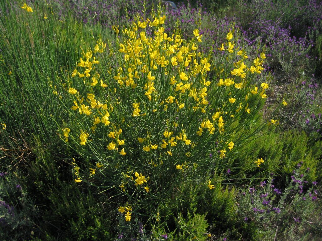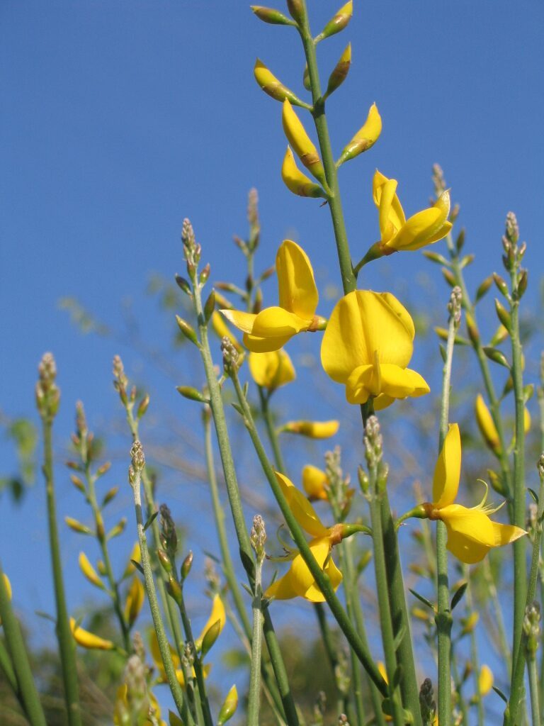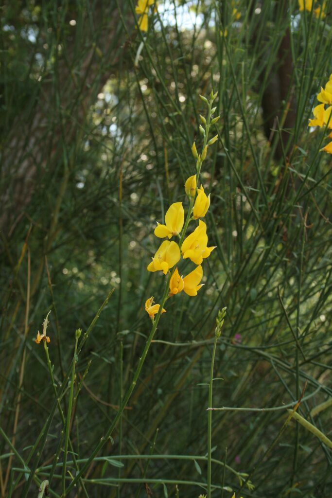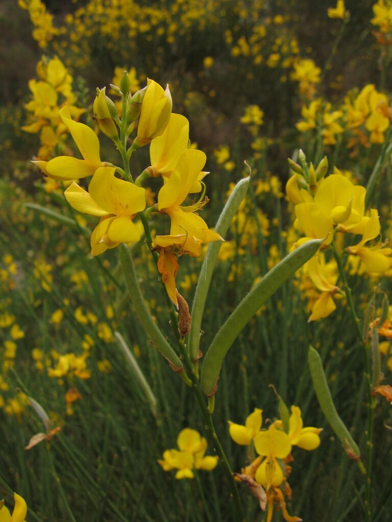 És un arbust alt de fins a 3 metres amb tiges cilíndriques i d’un color verd-grisenc. Les fulles són escasses, petites i aviat caduques, per la qual cosa sovint sembla que no en tingui. Les flors són d’un groc viu i molt oloroses, flairoses agrupades en raïms terminals acompanyades de petites bràctees ben aviat caduques, el calze té un sol llavi partit longitudinalment amb el marge que és membranòs i la corol·la amb l’estendard mucronat a l’àpex, el fruit en tavella llarga, comprimit, glabre i negrós a la maturitat que conté de 10 a 18 granes.