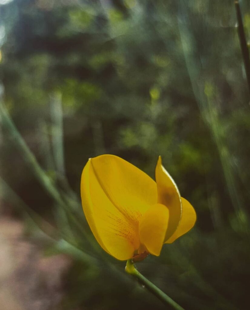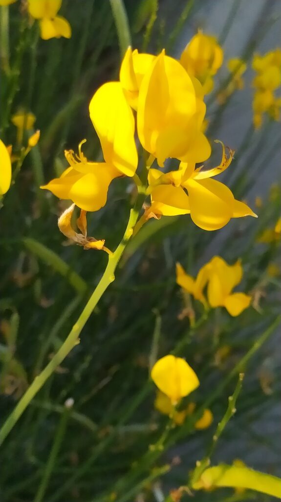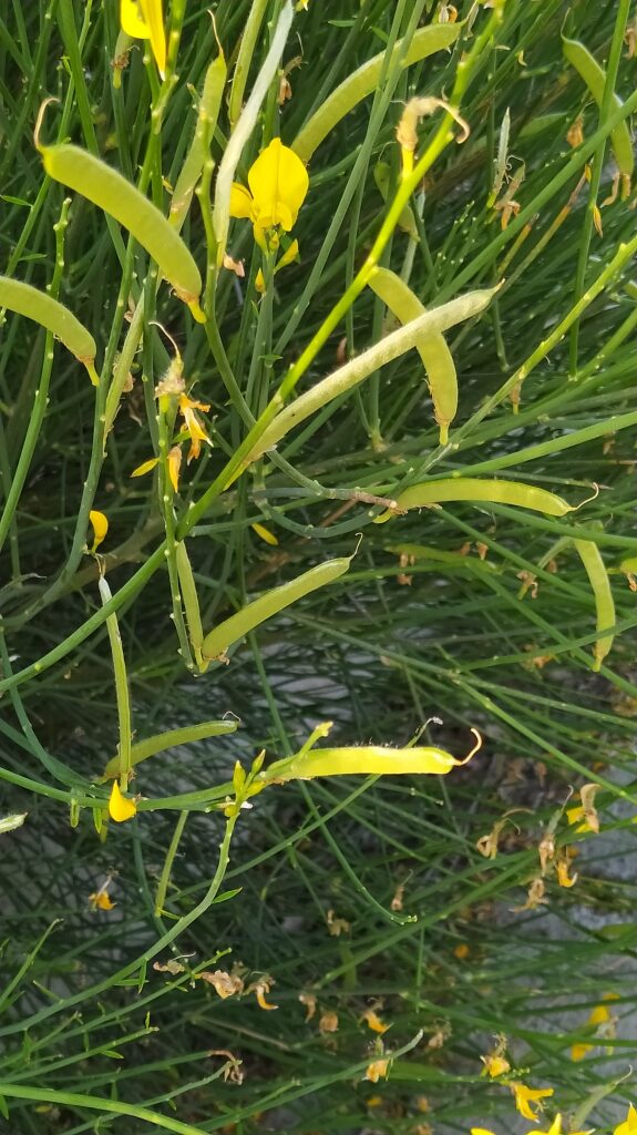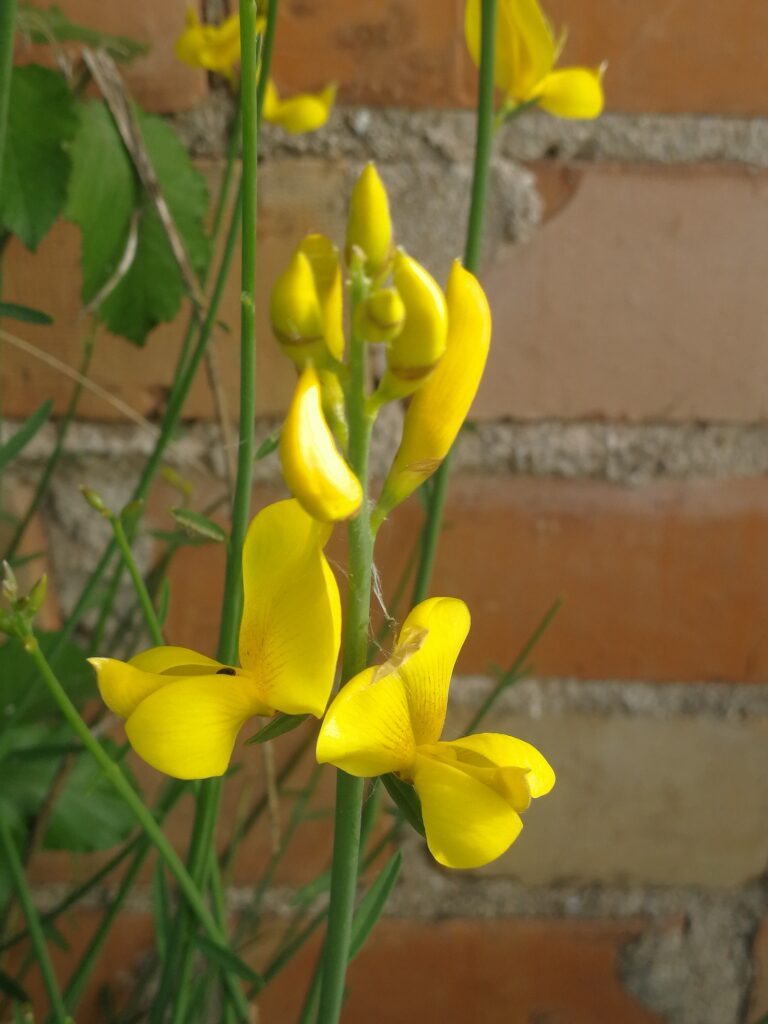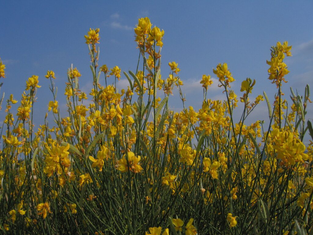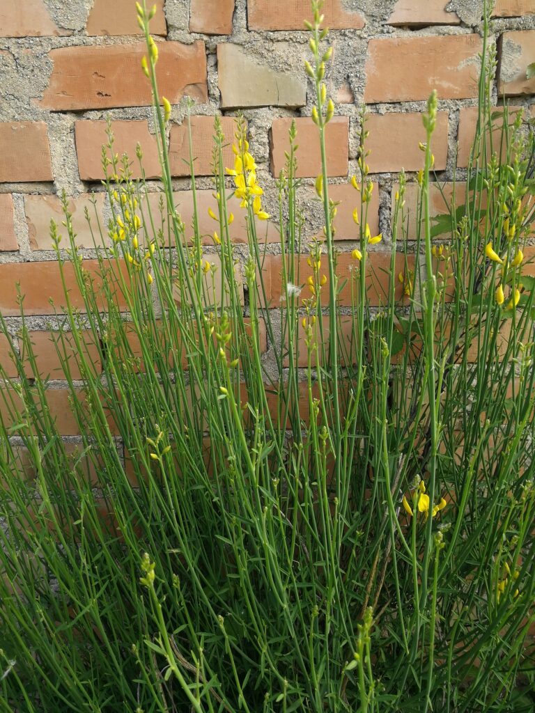 És un arbust alt de fins a 3 metres amb tiges cilíndriques i d’un color verd-grisenc. Les fulles són escasses, petites i aviat caduques, per la qual cosa sovint sembla que no en tingui. Les flors són d’un groc viu i molt oloroses, flairoses agrupades en raïms terminals acompanyades de petites bràctees ben aviat caduques, el calze té un sol llavi partit longitudinalment amb el marge que és membranòs i la corol·la amb l’estendard mucronat a l’àpex, el fruit en tavella llarga, comprimit, glabre i negrós a la maturitat que conté de 10 a 18 granes.