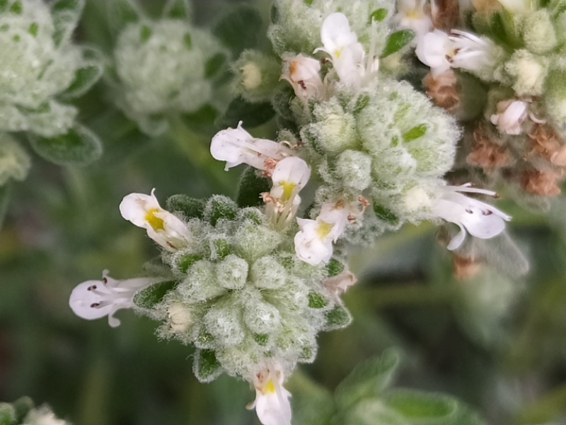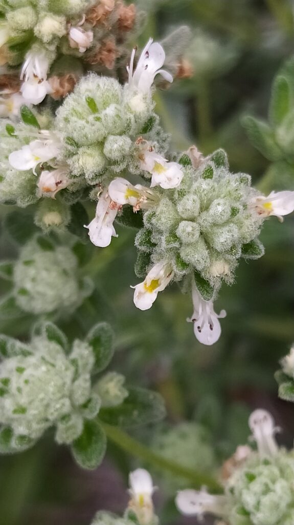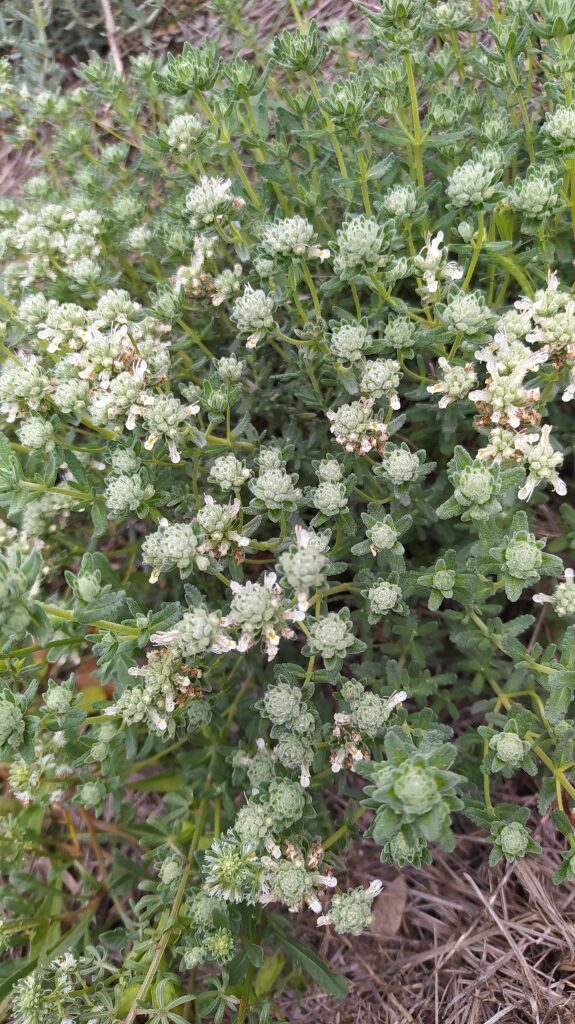 És una mata grisenca de 10-20 cm, erecta o ascendent, amb toment fi sovint aplicat. Les fulles són oposades, oblongues ± crenades o ondulades i d’àpex obtús. La inflorescència formada per glomèruls ordinàriament de més d’1-1,2 cm de diàmetre i amb bràctees de mida semblant o més llargues que les flors. El calze és de 5-7 mm de longitud, amb les dents triangulars de tendència aguda i la corol·la unilabiada de 7-9 mm, blanca o color de crema.