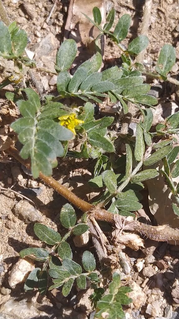 És una herba anual de 10-50 cm, reptant, ± pilosa, amb les tiges flexuoses i ramificades. Les fulles són oposades, paripinnades amb 6-8 parells de folíols oblongs amb estípules lanceolades o subulades i petites. Les flors de 4-5 mm, són solitàries i pedunculades amb 5 sèpals lliures, ovats i aguts, i 5 pètals grocs lliures, escotats i aguts. El fruit és indehiscent i format per 5 mericarpis que es separen a la maturitat, espinosos i tuberculats o alats.