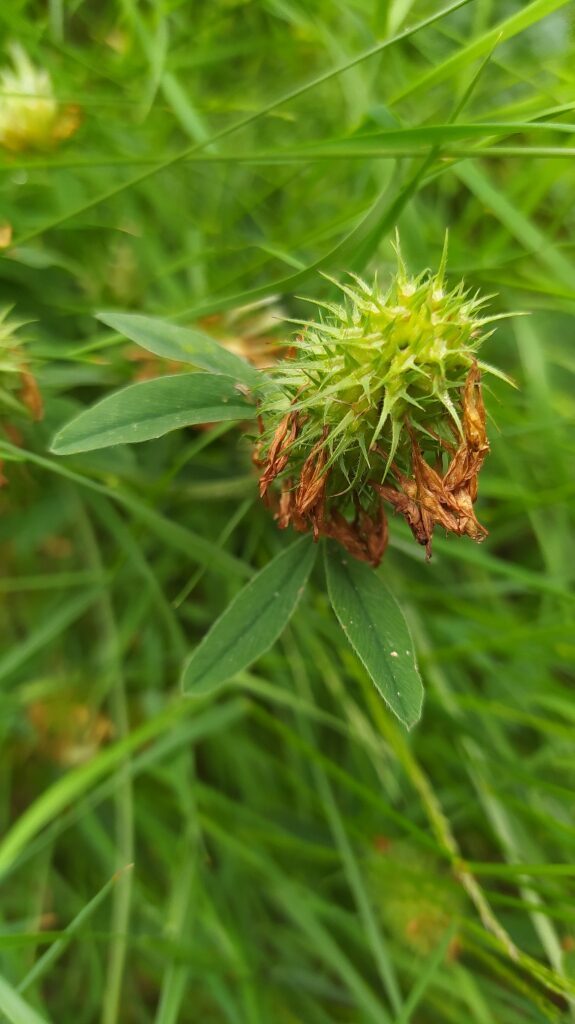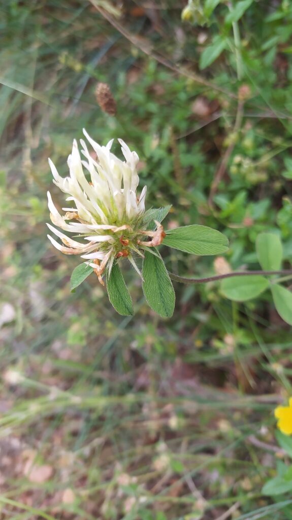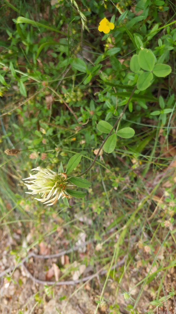 És una herba perenne de 20-50 cm, erecta o ascendent, pilosa amb les tiges dretes i amb els entrenusos superiors d’una gran longitud. Les fulles són peciolades i alternes, (les dues superiors subopsades) amb folíols subenters i pilosos per ambdues superfícies; els de les fulles inferiors ovoides o el·líptics i els de les fulles superiors oblongs. Les estípules són lanceolato-acuminades, membranoses i amb l’àpex verd. La inflorescència és en glomèrul esferoïdal o oblong. El calze és un tub pilós de dents lanceolato-linears molt desiguals. La corol·la és d’un blanc groguenc i de longitud molt superior a la del calze.