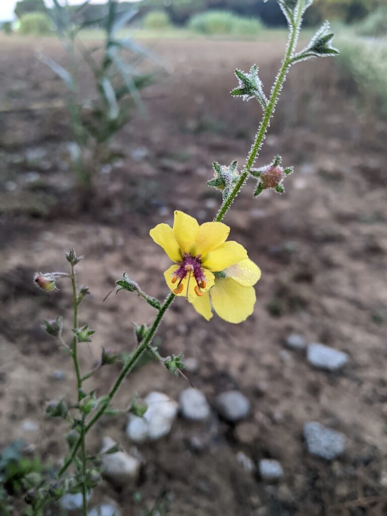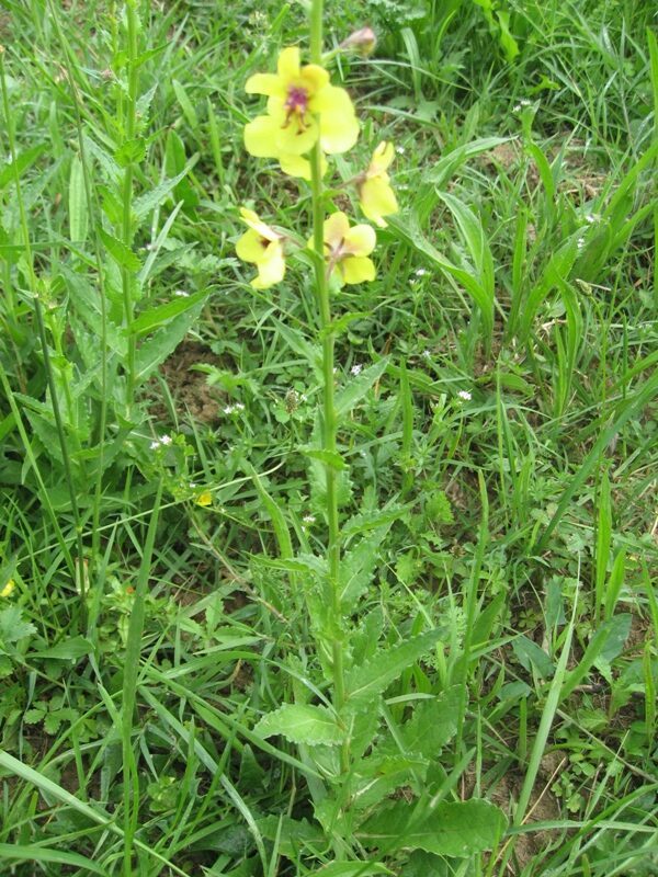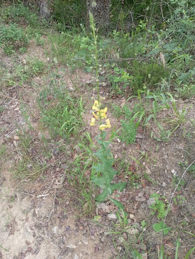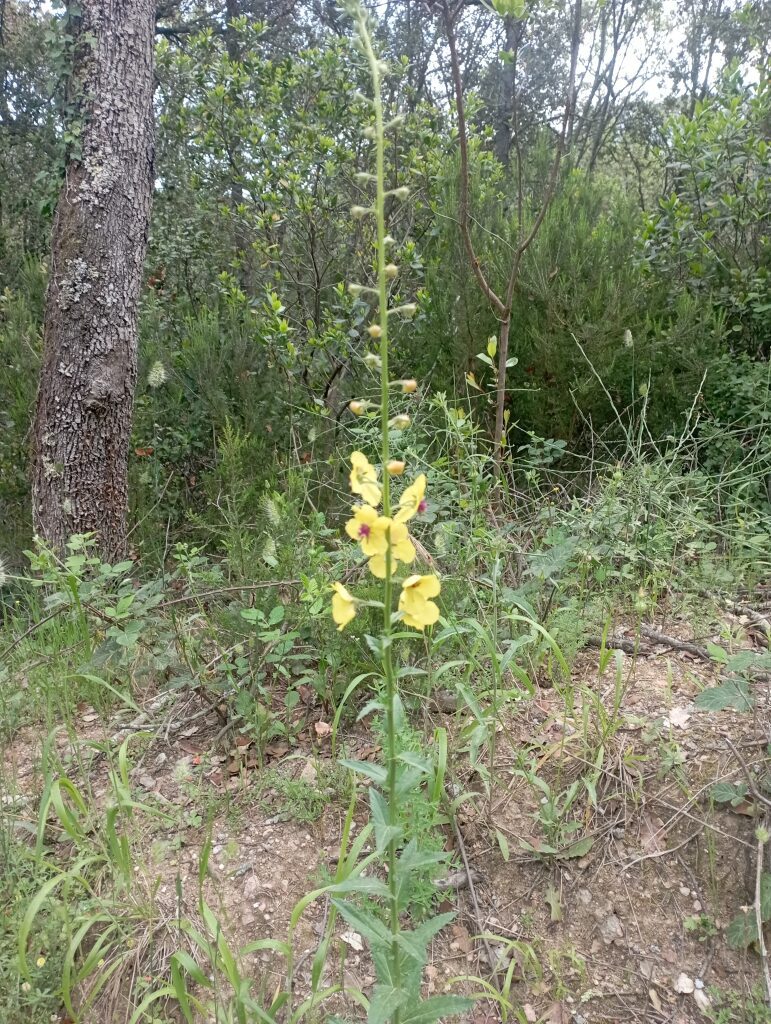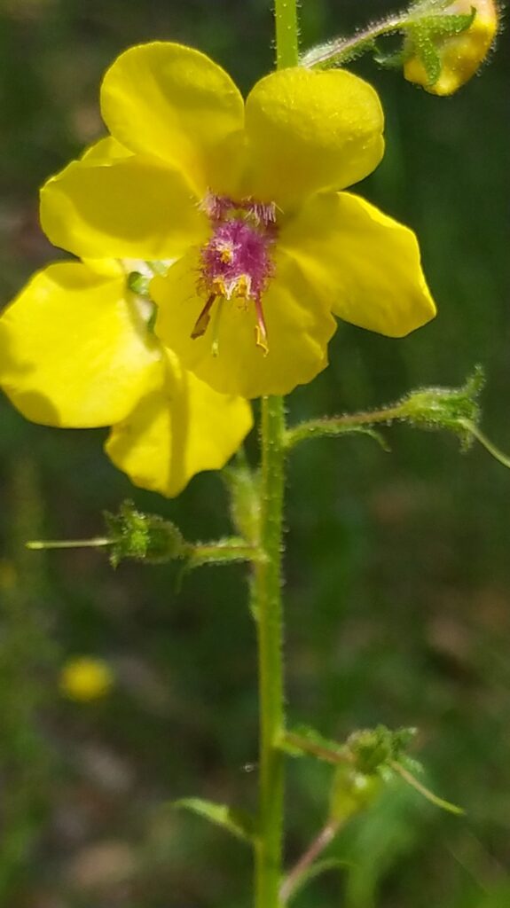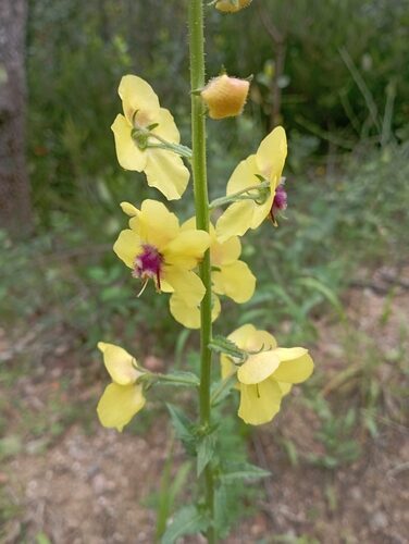 És una herba biennal de 30-100 cm, erecta, simple o poc ramificada, glabra a la part inferior i amb pubescència laxa i glandular a la summitat. Les fulles inferiors són glabres, oblongues, dentades o pinnatífides i sèssils o curtament peciolades, les superiors més petites, ovades i semiamplexicaules. La inflorescència en raïm lax i multiflor, amb bràctees ovades o lanceolades i pedicels de 5-25 mm. Les flors són solitàries amb calze de sèpals estretament lanceolats i aguts, corol·la groga i 5 estams amb els filaments coberts de pèls violacis. El fruit és una càpsula esferoïdal.