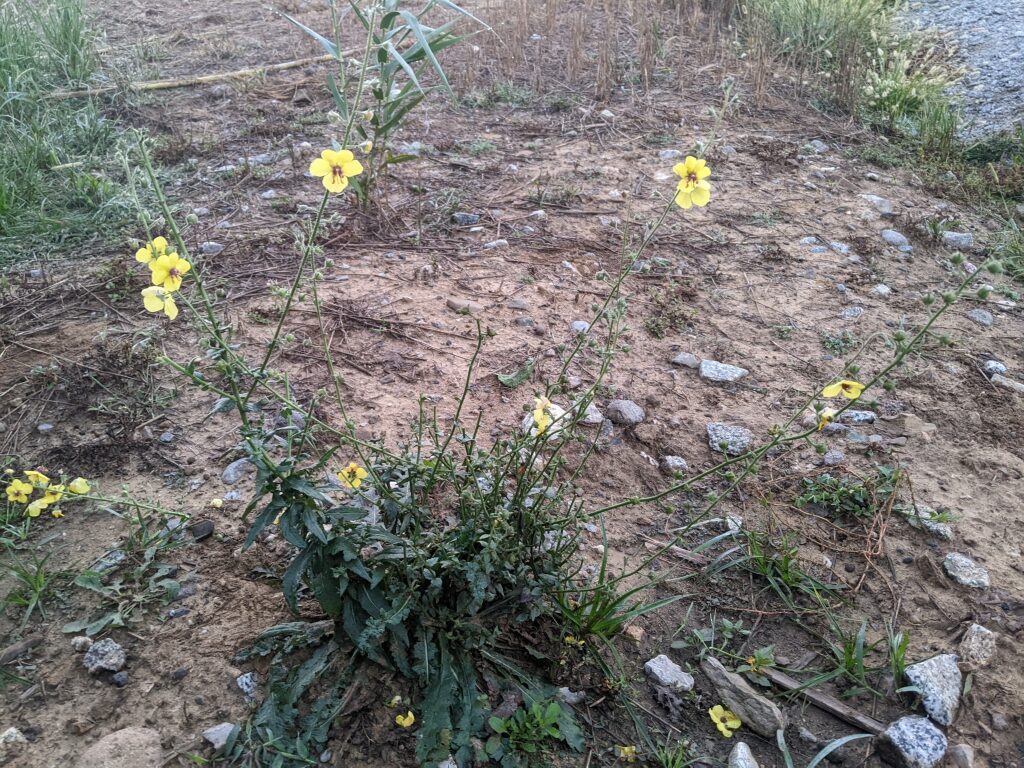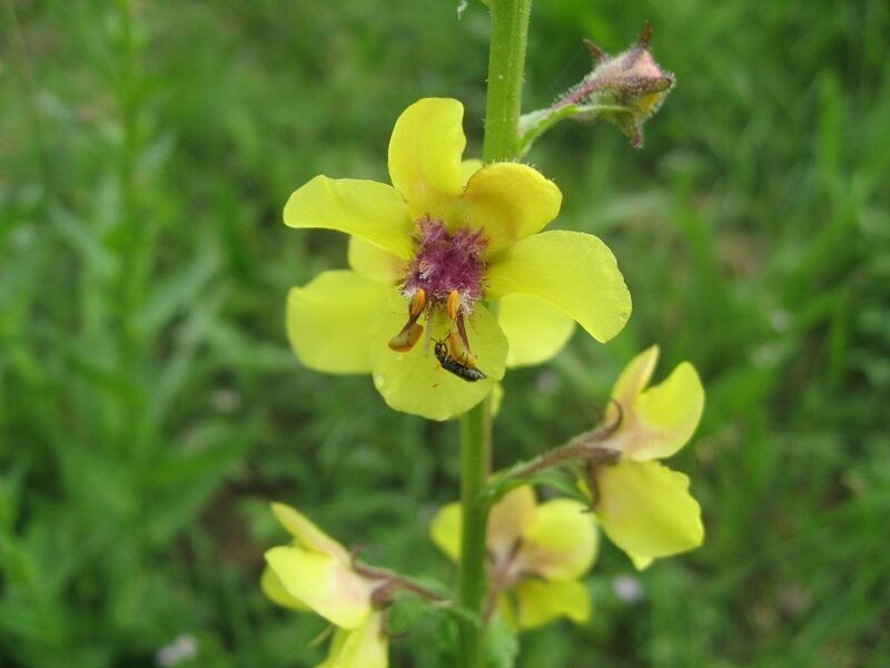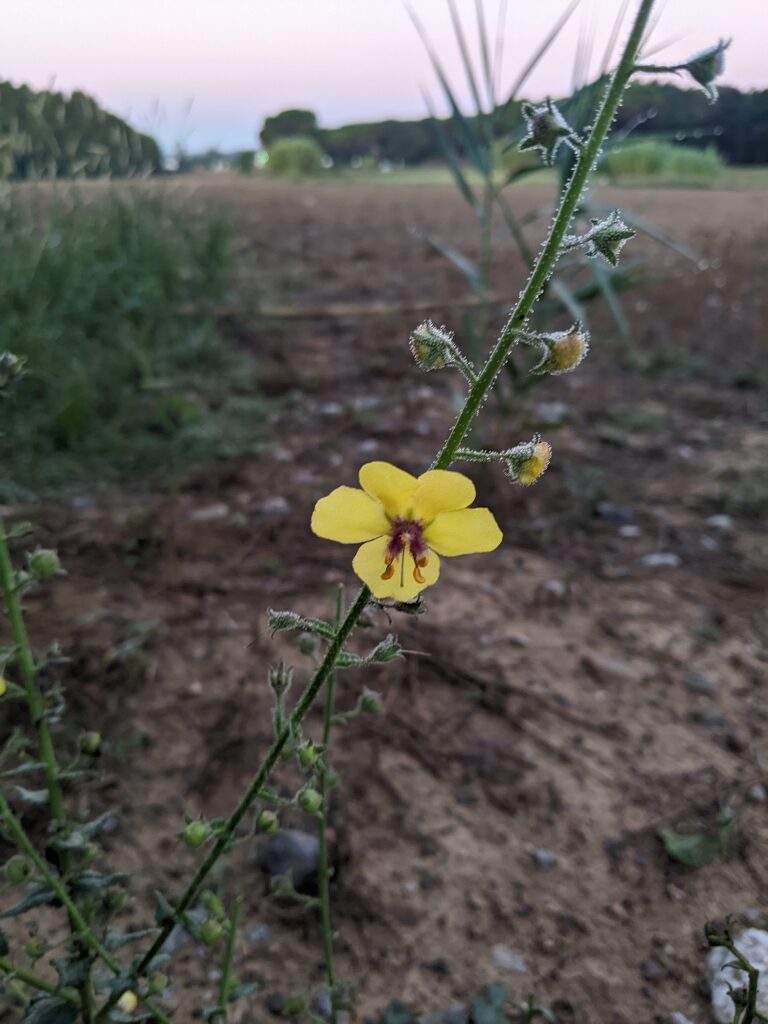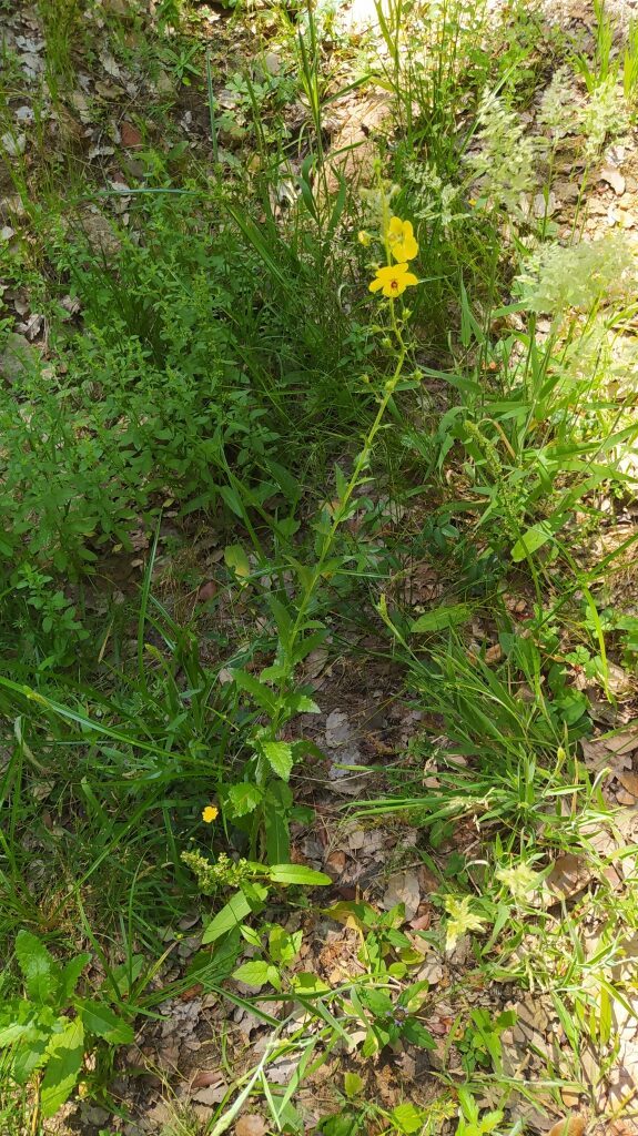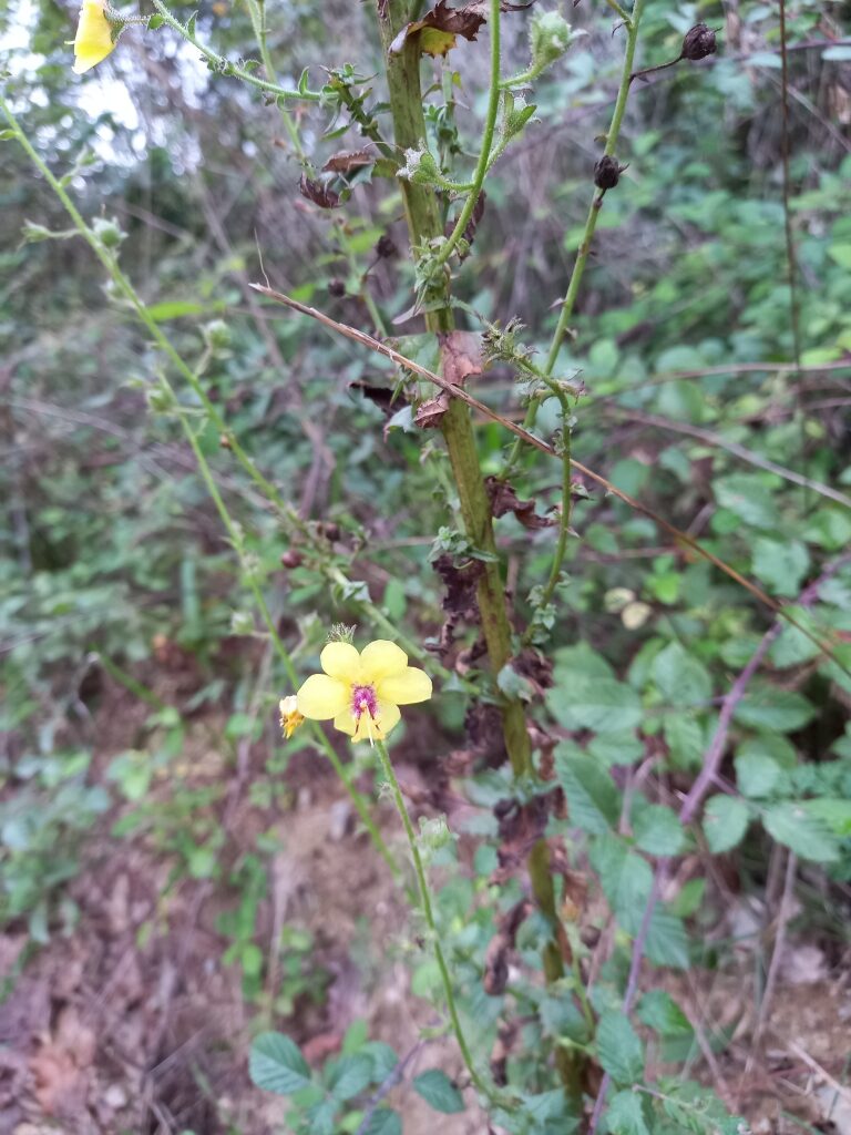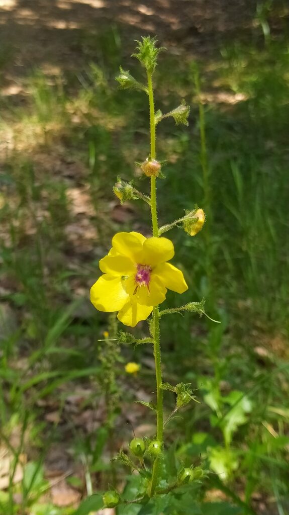És una herba biennal de 30-100 cm, erecta, simple o poc ramificada, glabra a la part inferior i amb pubescència laxa i glandular a la summitat. Les fulles inferiors són glabres, oblongues, dentades o pinnatífides i sèssils o curtament peciolades, les superiors més petites, ovades i semiamplexicaules. La inflorescència en raïm lax i multiflor, amb bràctees ovades o lanceolades i pedicels de 5-25 mm. Les flors són solitàries amb calze de sèpals estretament lanceolats i aguts, corol·la groga i 5 estams amb els filaments coberts de pèls violacis. El fruit és una càpsula esferoïdal.