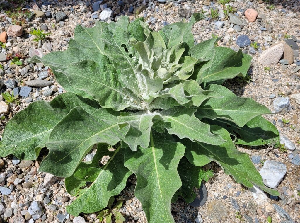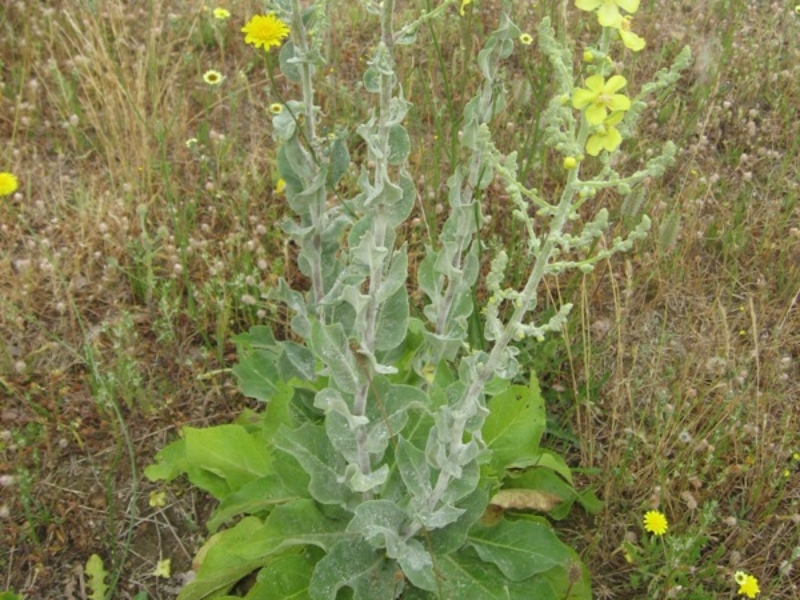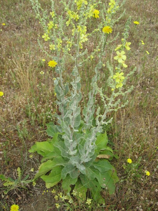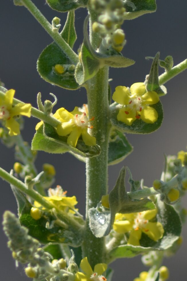És una herba biennal d’1-2 m, erecta, robusta i tota ella gris-tomentosa. Les fulles són cobertes a totes dues superfícies d’un toment blanquinós que es desprèn a flocs, les basals són obovato-oblongues, de contorn subenter o ± dentat amb la base cuneada, sèssils o atenuades amb pecíol curt, i les caulinars són més petites totes sèssils. La inflorescència es una panícula molt ramificada i ampla, amb bràctees enteres de 3-5 mm i 3-10 flors agrupades en fascicles a cada bràctea, el calze amb els sèpals linears i aguts, la corol·la groga té filaments estaminals amb pèls blancs. La càpsula obovoide és més llarga que el calze i tomentosa.