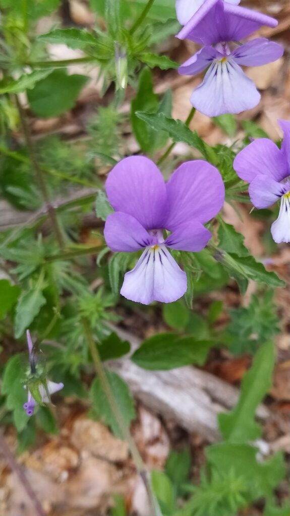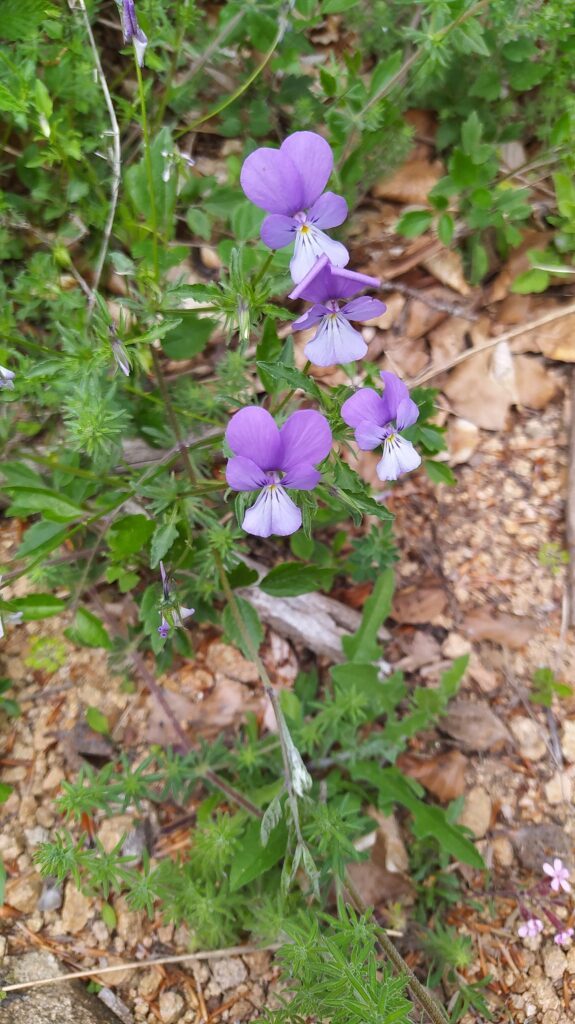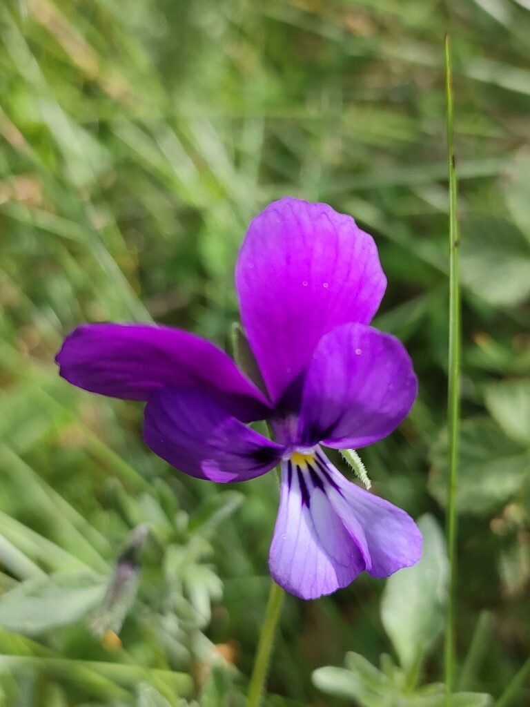És una herba perenne de 10-40 cm, erecta o ascendent ± pilosa i estolonífera. Les fulles són peciolades amb el limbe ovat o ovato-oblong, l’àpex és obtús i el contorn crenat. Les estípules són palmatipartides amb 3-5 segments al costat extern i 2-3 al costat intern. Els peduncles són de 4-11 cm. Les flors són de 2-3,5 cm d’un blau violaci fosc, amb sèpals de 9-13 mm en general amb el marge ± ciliat i uns apèndixs de fins a 2,5 mm. La corol·la té 5 pètals,dirigits 4 cap amunt i un cap avall, l’esperó de 6-8 mm de longitud i 5-6 vegades superior als apèndixs del calze. El fruit és una càpsula glabra erecta a la maturitat.